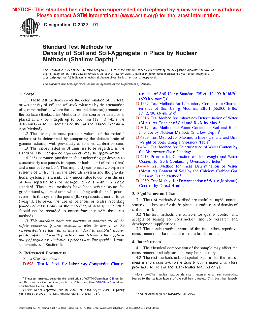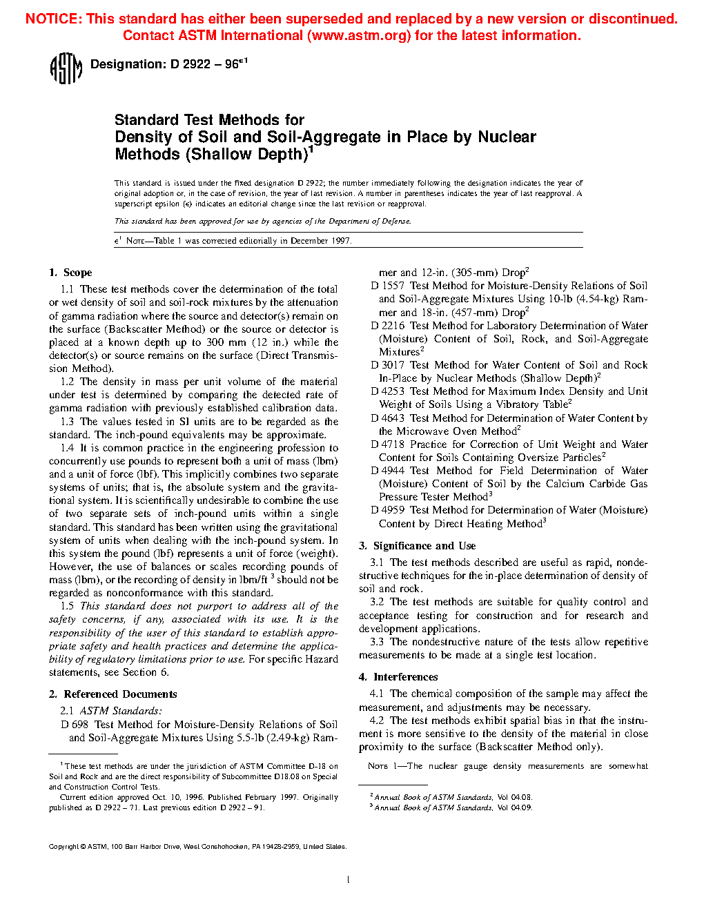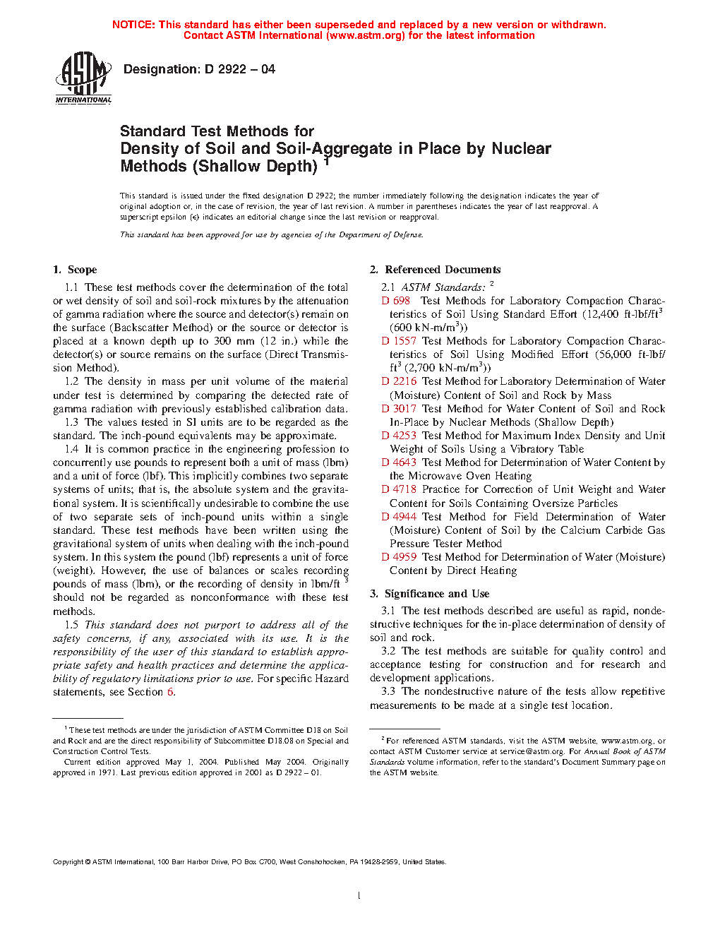 1.1 This test method covers the determination of the total or wet density of soil and soil-rock mixtures by the attenuation of gamma radiation where the source and detector(s) remain on the surface (Backscatter Method) or the source or detector is placed at a known depth up to 300 mm (12 in.) while the detector(s) or source remains on the surface (Direct Transmission Method).