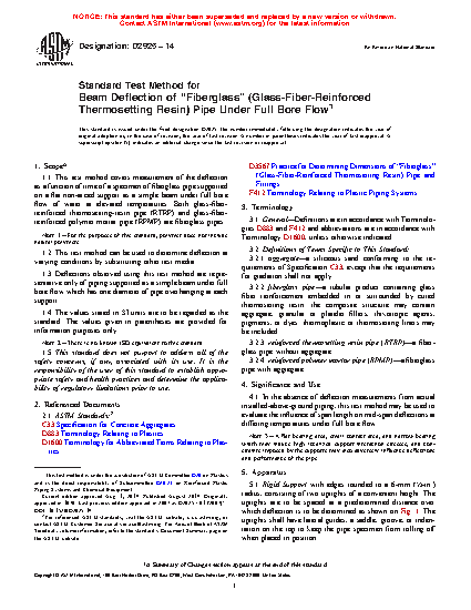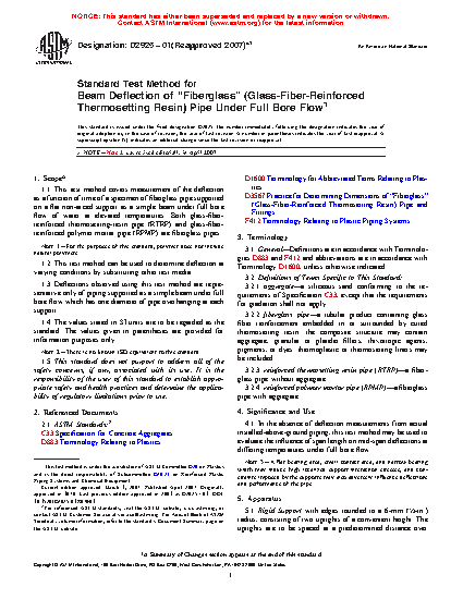 1.1 This test method covers measurement of the deflection as a function of time of a specimen of fiberglass pipe supported on a flat non-arced support as a simple beam under full bore flow of water at elevated temperatures. Both glass-fiber-reinforced thermosetting-resin pipe (RTRP) and glass-fiber-reinforced polymer mortar pipe (RPMP) are fiberglass pipes.