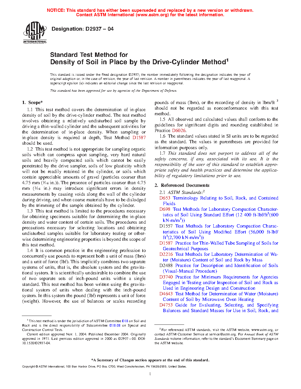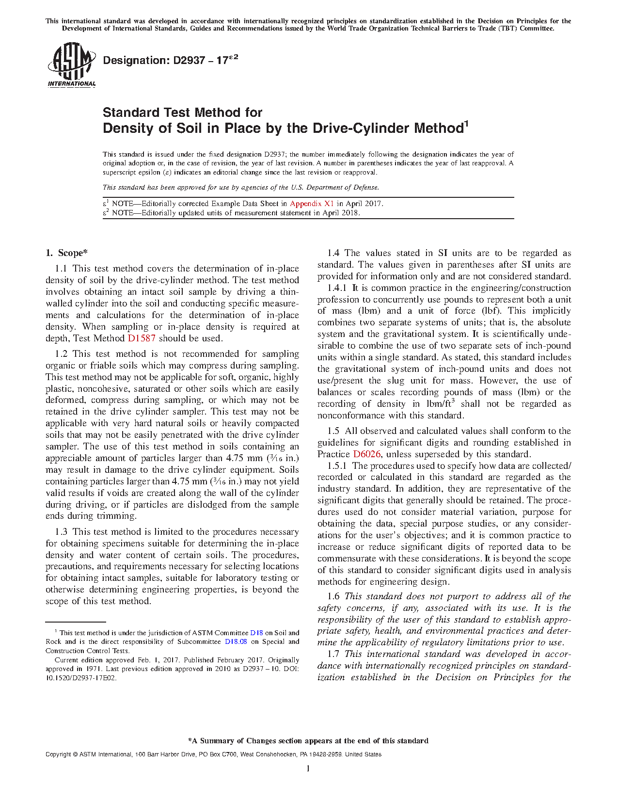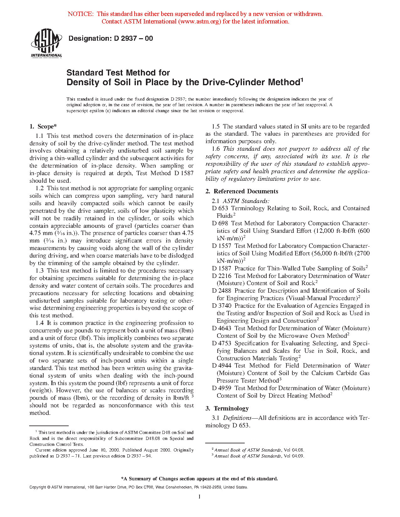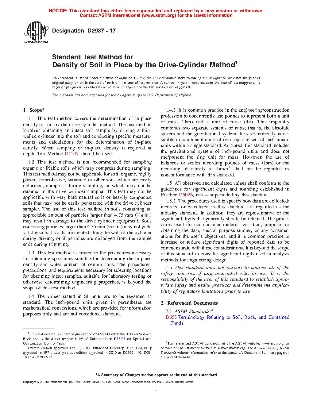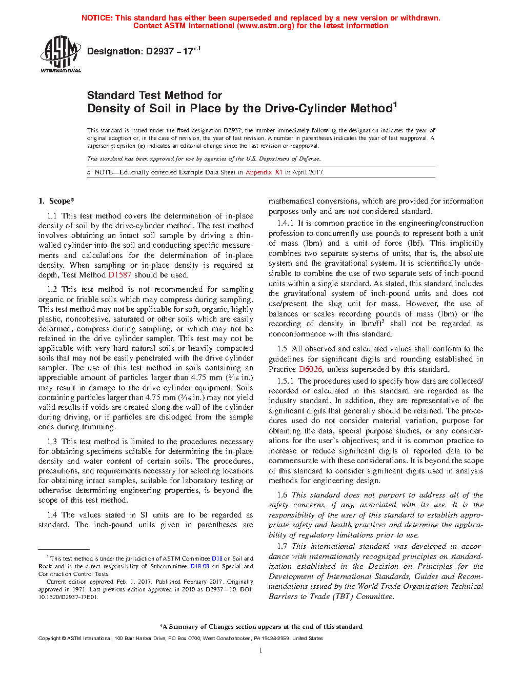 1.1 This test method covers the determination of in-place density of soil by the drive-cylinder method. The test method involves obtaining a relatively intact soil sample by driving a thin-walled cylinder and the subsequent activities for the determination of in-place density. When sampling or in-place density is required at depth, Test Method D1587 should be used.