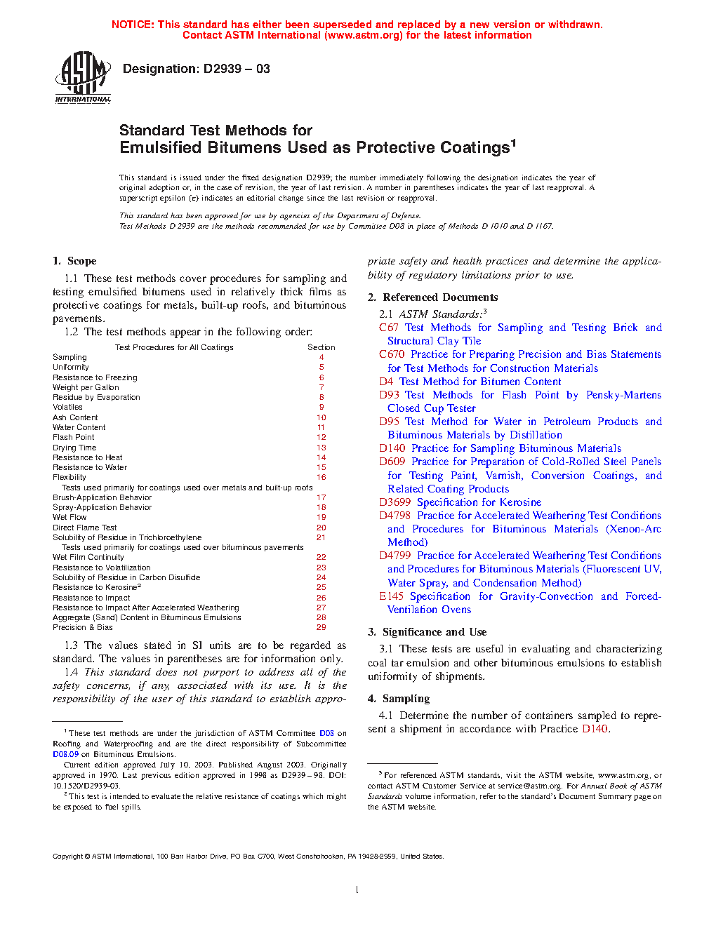1.1 These test methods cover procedures for sampling and testing emulsified bitumens used in relatively thick films as protective coatings for metals, built-up roofs, and bituminous pavements.