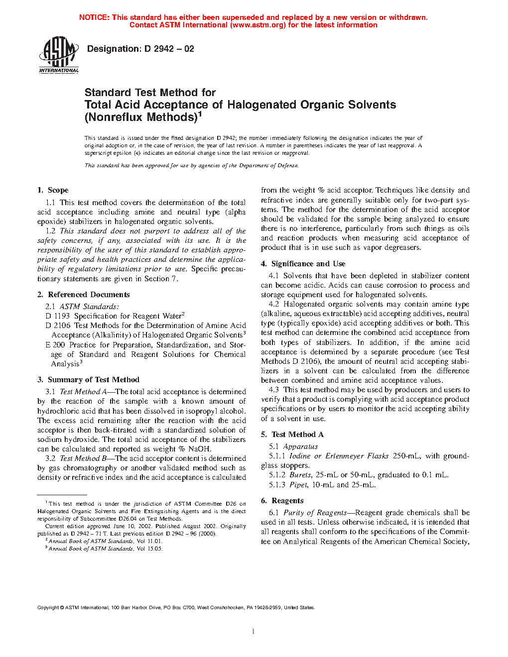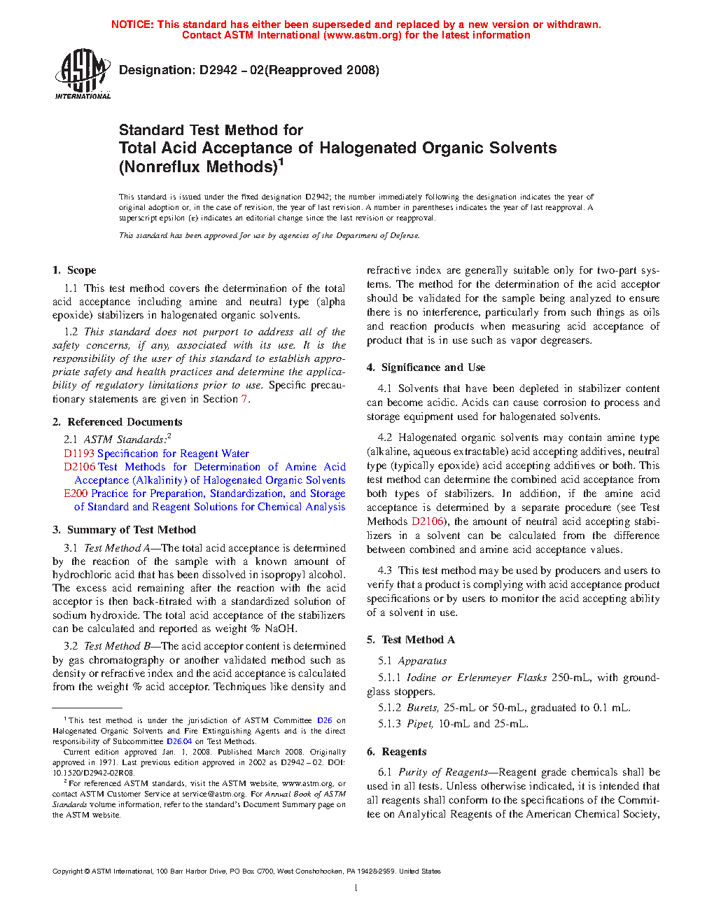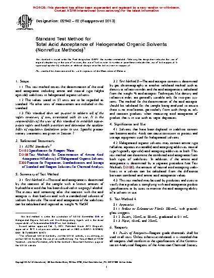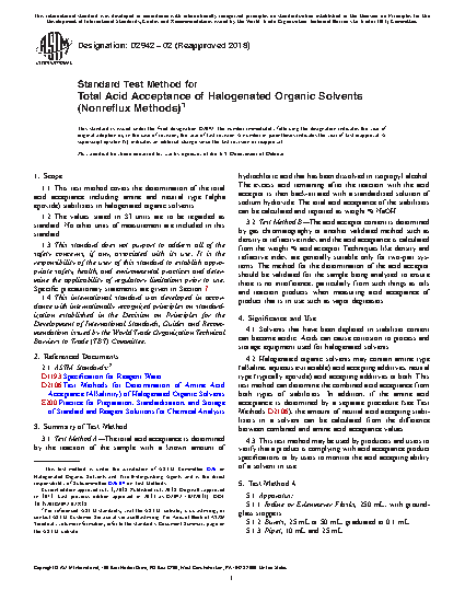 4.3 This test method may be used by producers and users to verify that a product is complying with acid acceptance product specifications or by users to monitor the acid accepting ability of a solvent in use.