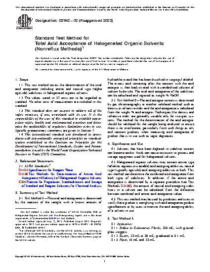 1.1 This test method covers the determination of the total acid acceptance including amine and neutral type (alpha epoxide) stabilizers in halogenated organic solvents.