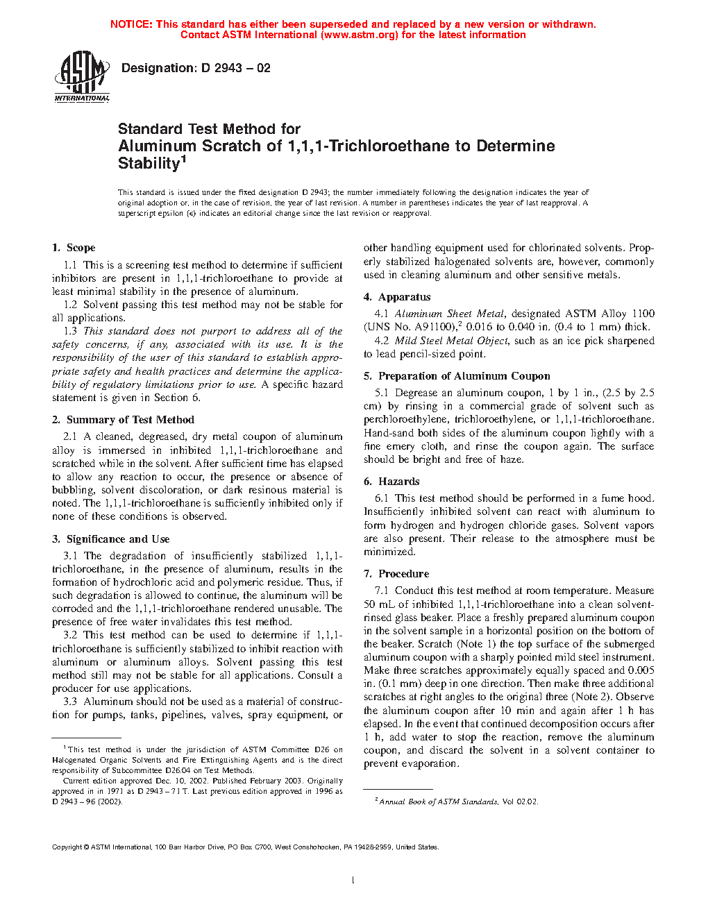 This test method can be used to determine if 1,1,1-trichloroethane is sufficiently stabilized to inhibit reaction with aluminum or aluminum alloys. Solvent passing this test method still may not be stable for all applications. Consult a producer for use applications.