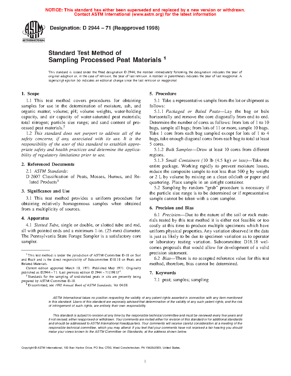 1.1 This test method covers procedures for obtaining samples for use in the determination of moisture, ash, and organic matter; volume; pH; volume weights, water-holding capacity, and air capacity of water-saturated peat materials; total nitrogen; particle size range; and sand content of processed peat materials.