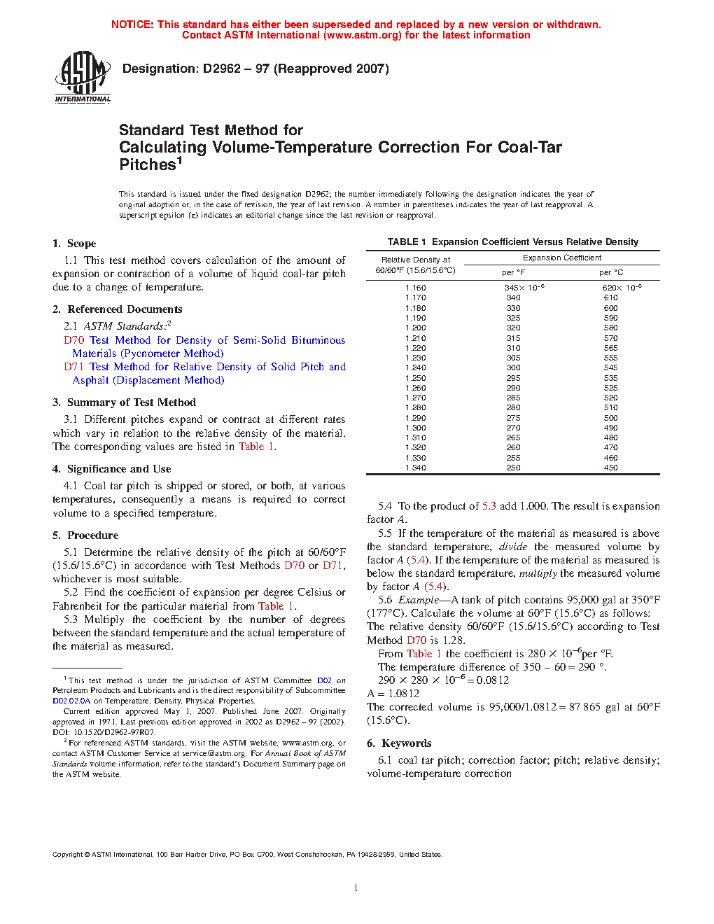 1.1 This practice covers calculation of the amount of expansion or contraction of a volume of liquid coal-tar pitch due to a change of temperature.