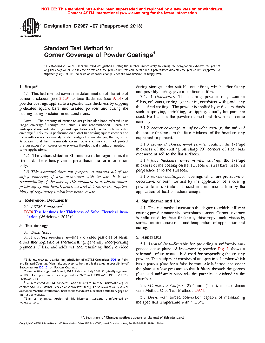 1.1 This test method covers the determination of the ratio of corner thickness (see 3.1.3) to face thickness (see 3.1.4) of powder coatings applied to a specific face thickness by dipping preheated square bars into aerated powder and curing the coating using predetermined conditions.