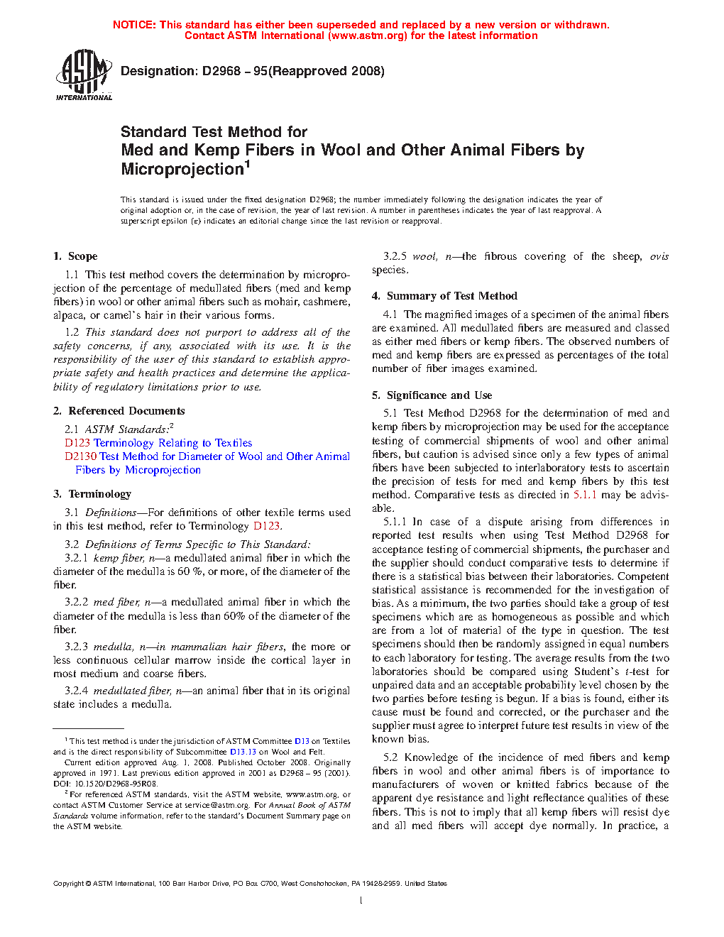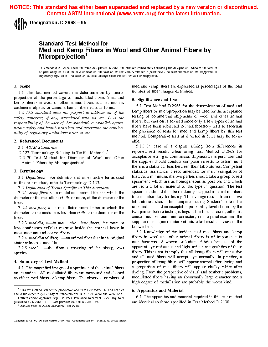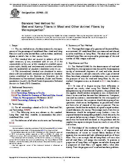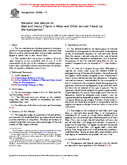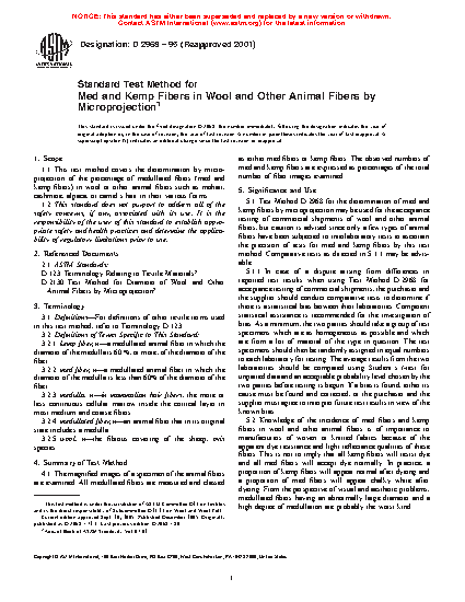 5.1 Test Method D2968 for the determination of med and kemp fibers by microprojection may be used for the acceptance testing of commercial shipments of wool and other animal fibers, but caution is advised since only a few types of animal fibers have been subjected to interlaboratory tests to ascertain the precision of tests for med and kemp fibers by this test method. Comparative tests as directed in 5.1.1 may be advisable.