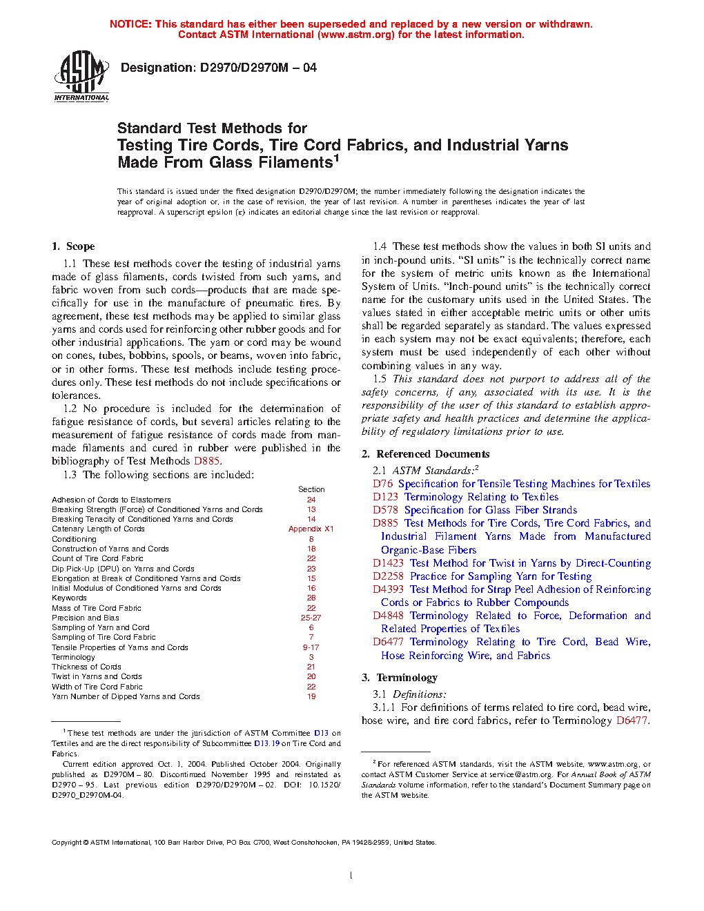 1.3 The following sections are included: Adhesion of Cords to Elastomers (24); Breaking Strength (Force) of Conditioned Yarns and Cords (13); Breaking Tenacity of Conditioned Yarns and Cords (14); Catenary Length of Cords (Appendix X1); Conditioning (8); Construction of Yarns and Cords (18); Count of Tire Cord Fabric (22); Dip Pick-Up (DPU) on Yarns and Cords (23); Elongation at Break of Conditioned Yarns and Cords (15); Initial Modulus of Conditioned Yarns and Cords (16); Keywords (28); Mass of Tire Cord Fabric (22); Precision and Bias (25-27); Sampling of Yarn and Cord (6); Sampling of Tire Cord Fabric (7); Tensile Properties of Yarns and Cords (9-17); Terminology (3); Thickness of Cords (21); Twist in Yarns and Cords (20); Width of Tire Cord Fabric (22); Yarn Number of Dipped Yarns and Cords (19).