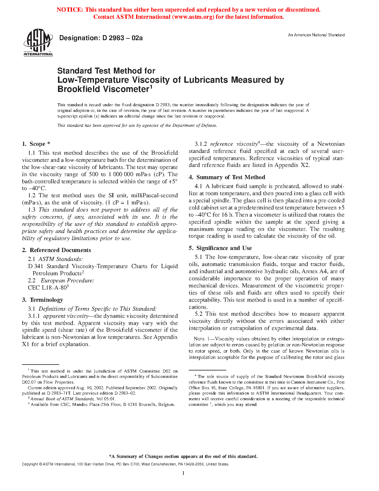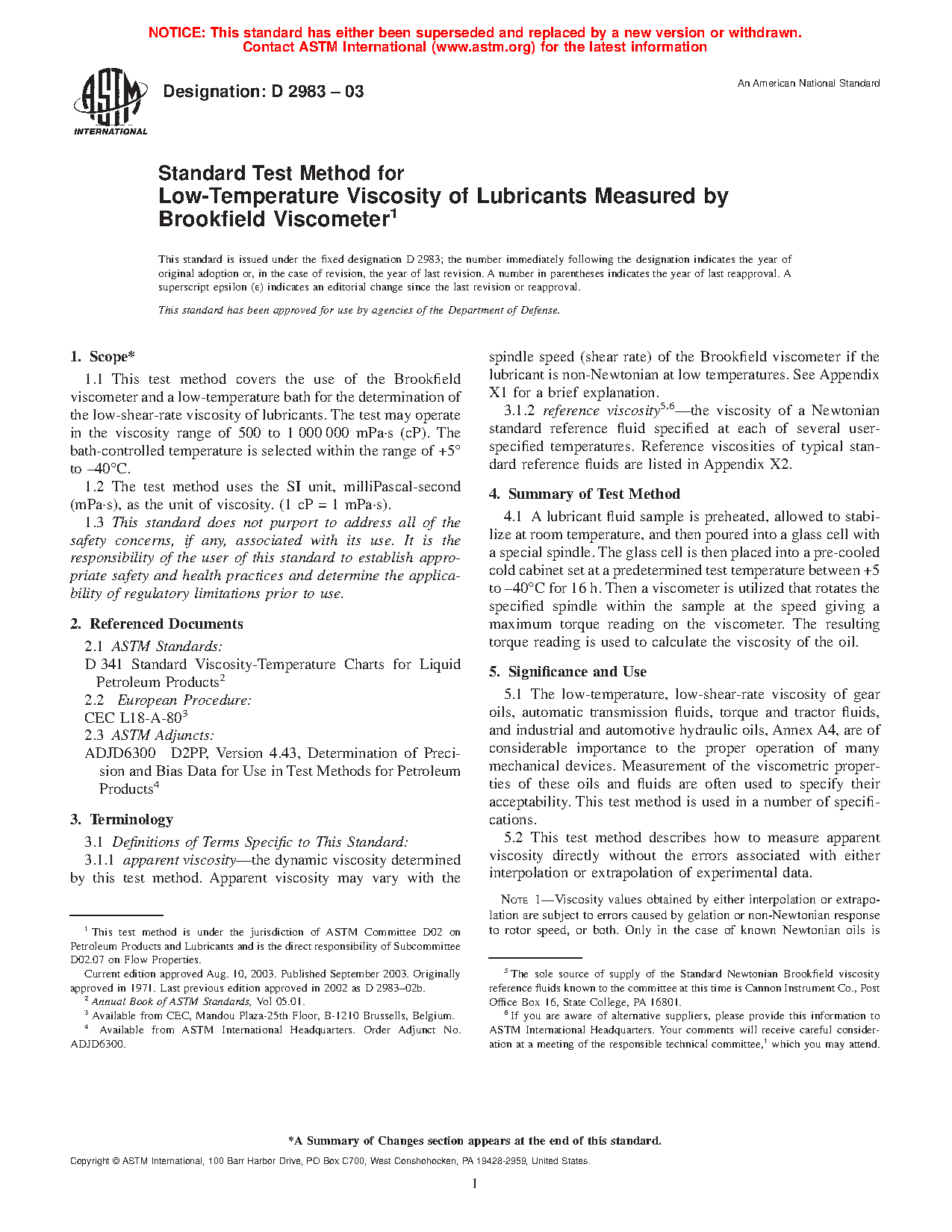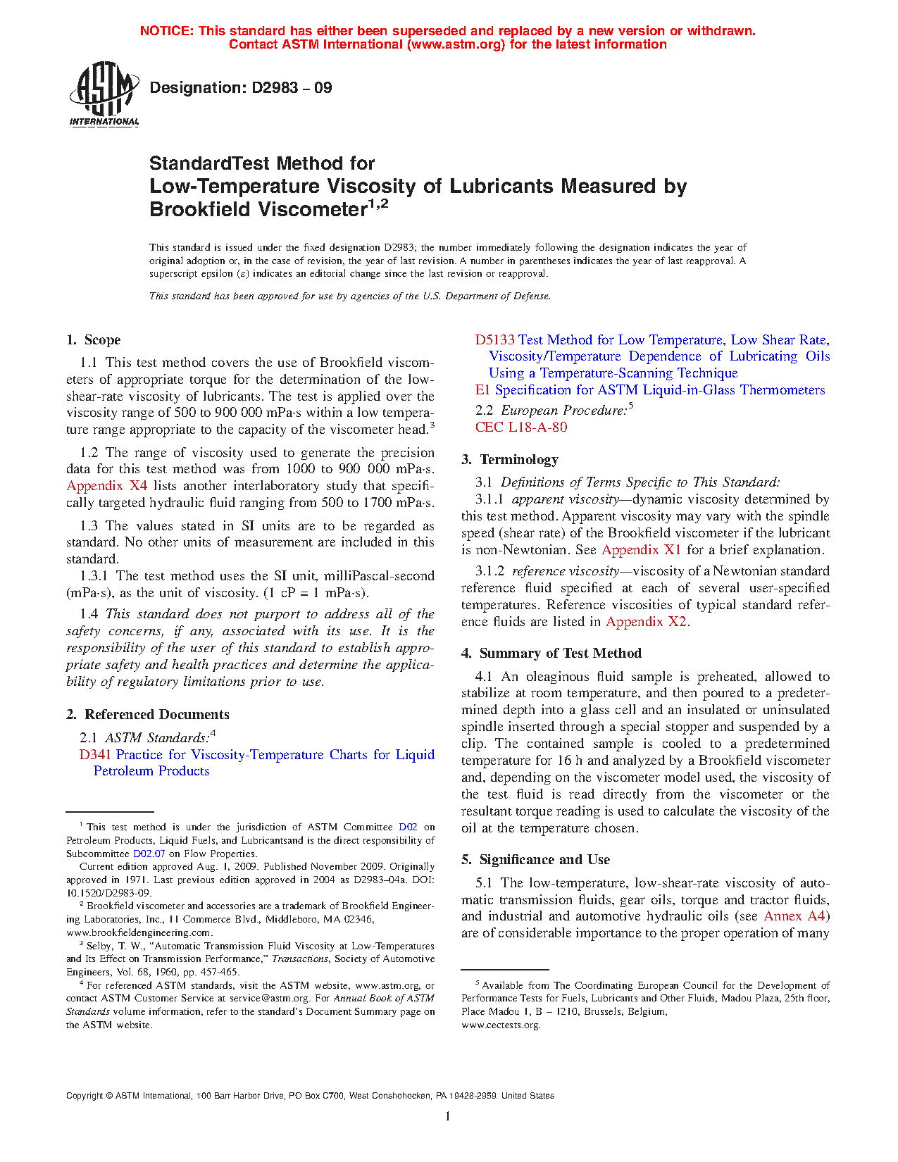 1.2 This test method was previously titled “Low-Temperature Viscosity of Lubricants Measured by Brookfield Viscometer.” In the lubricant industry, D2983 test results have often been referred to as “Brookfield2 Viscosity” which implies a viscosity determined by this method.