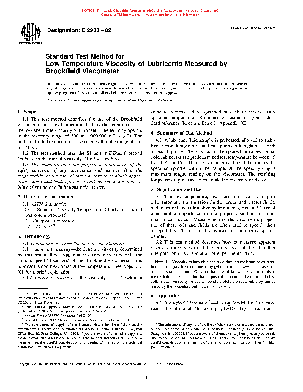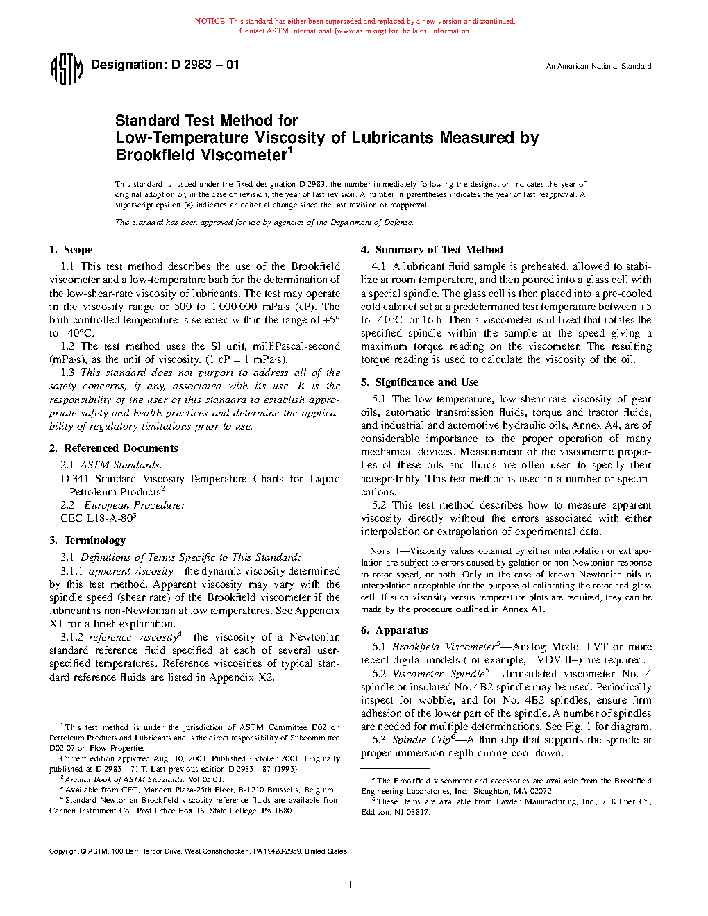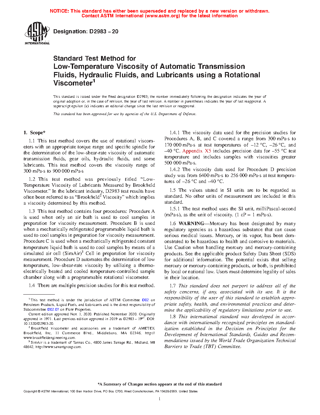 1.2 This test method was previously titled “Low-Temperature Viscosity of Lubricants Measured by Brookfield Viscometer.” In the lubricant industry, D2983 test results have often been referred to as “Brookfield2 Viscosity” which implies a viscosity determined by this method.