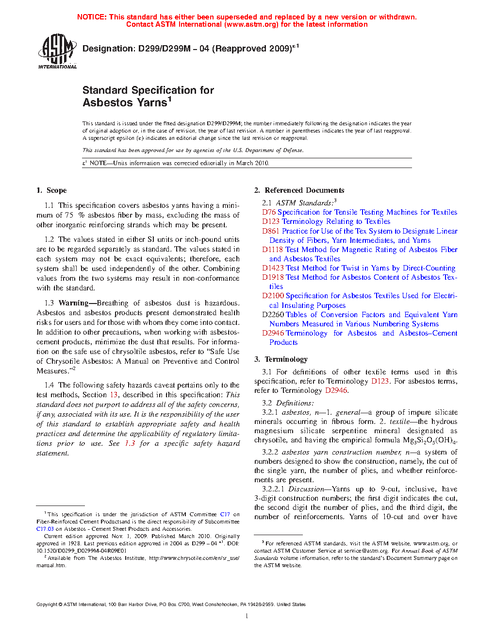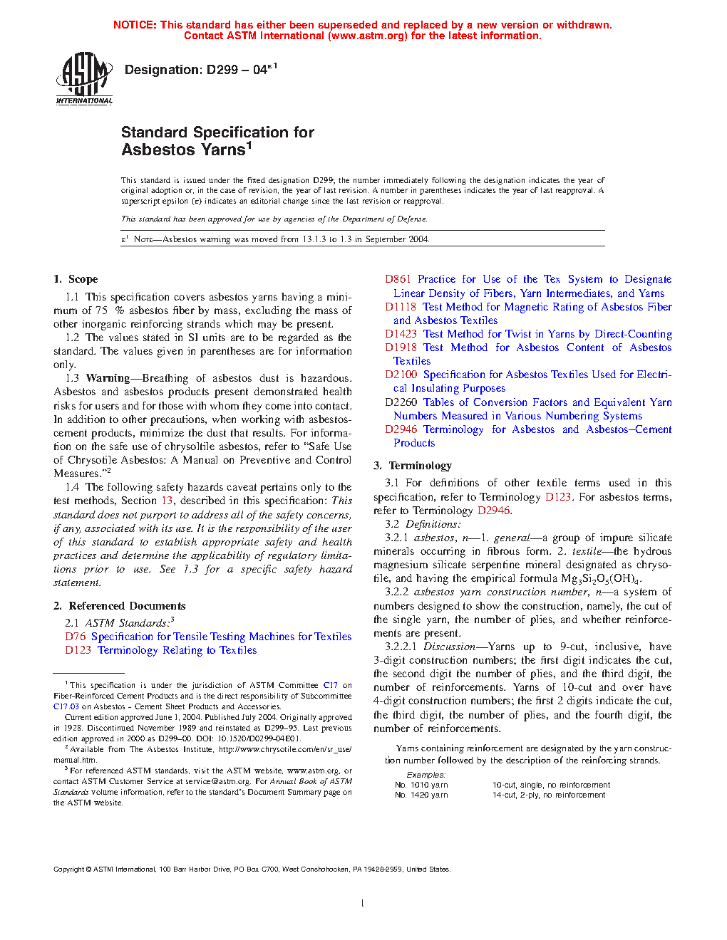 This specification covers asbestos yarns having a specified minimum % mass of asbestos fiber, excluding the mass of other inorganic reinforcing strands which may be present. Asbestos yarns covered here are classified based on their structural component as follows: Class A, yarn consisting of asbestos fiber or asbestos and other fibers; Class B, yarn containing wire reinforcements; Class C, yarn containing organic reinforcing strands; Class D, yarn containing nonmetallic inorganic reinforcing strands; and Class E, yarn containing a combination of the reinforcing strands used in Classes B through D. On the other hand, the grades (Commercial, Underwriters', A, AA, AAA, and AAAA) of asbestos yarn are based on the percentage of asbestos content by mass. Yarns shall be sampled, prepared, tested and conform accordingly to physical (asbestos and reinforcement type and content), electromagnetic (magnetic rating and electrical insulation), mechanical (tensile or breaking strength), and dimensional (yarn number, twist direction, and number of turns per unit length) property requirements.