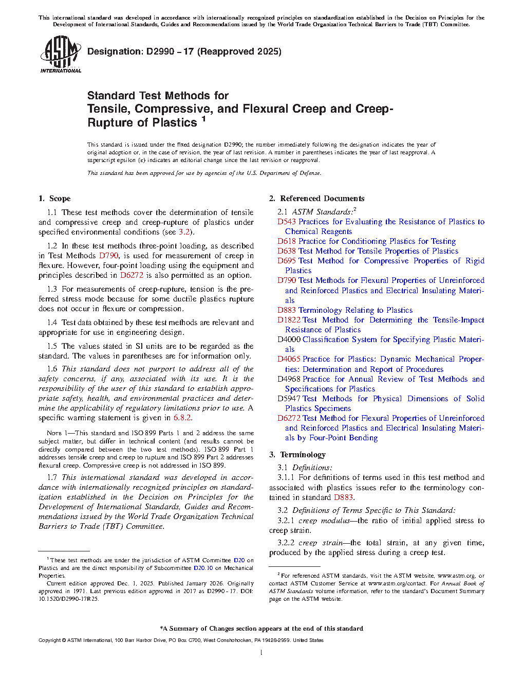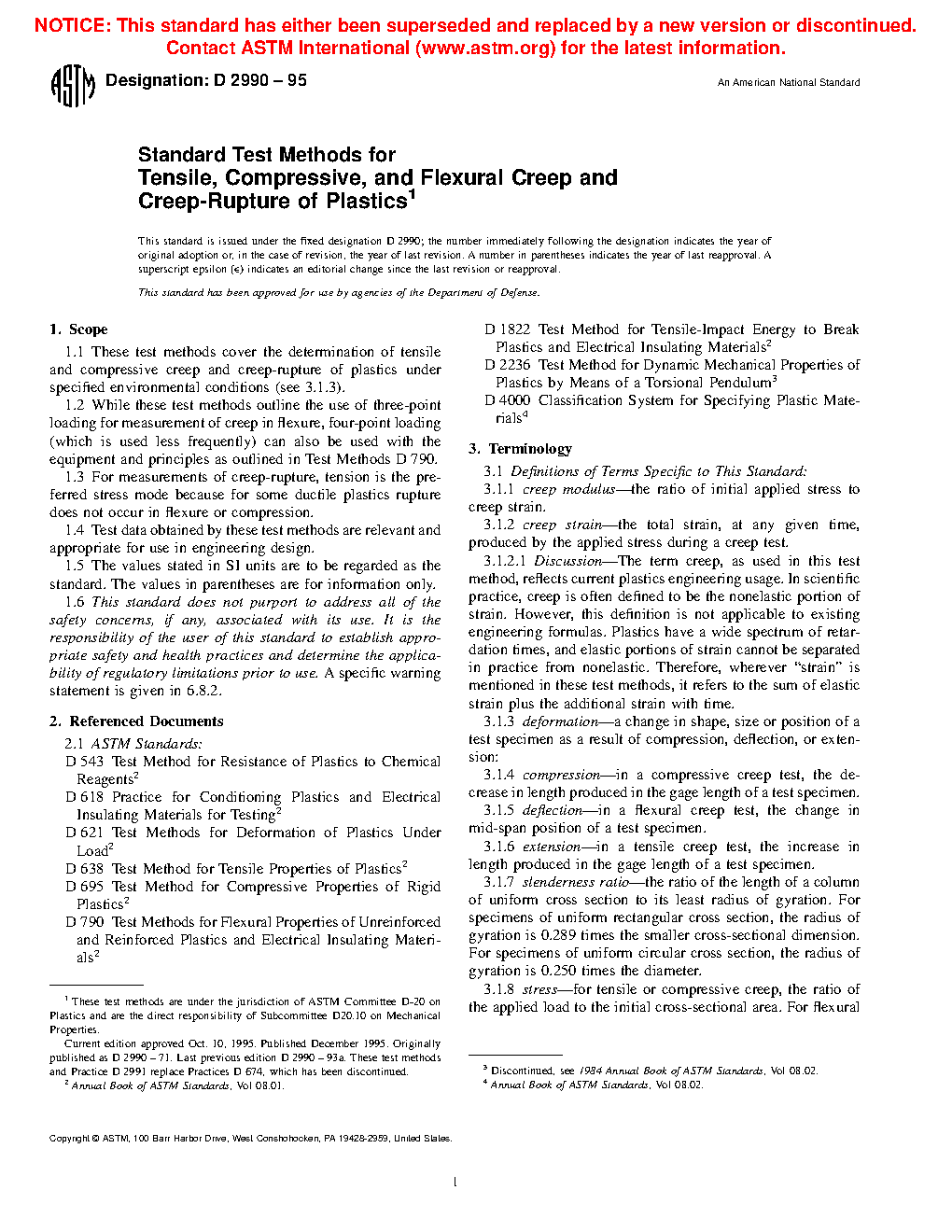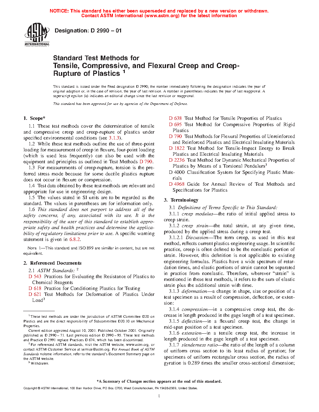 1.1 These test methods cover the determination of tensile and compressive creep and creep-rupture of plastics under specified environmental conditions (see 3.2).