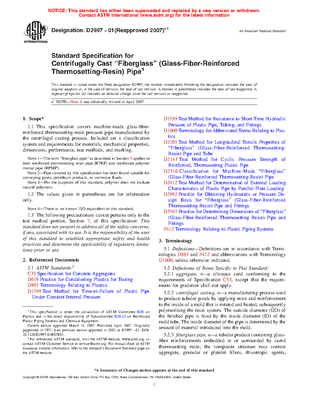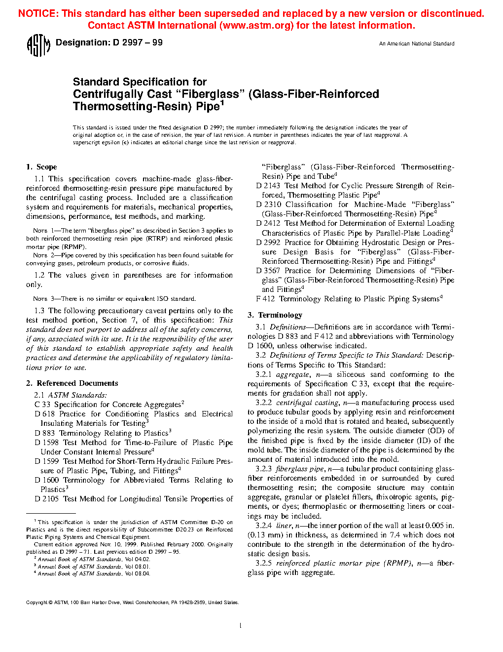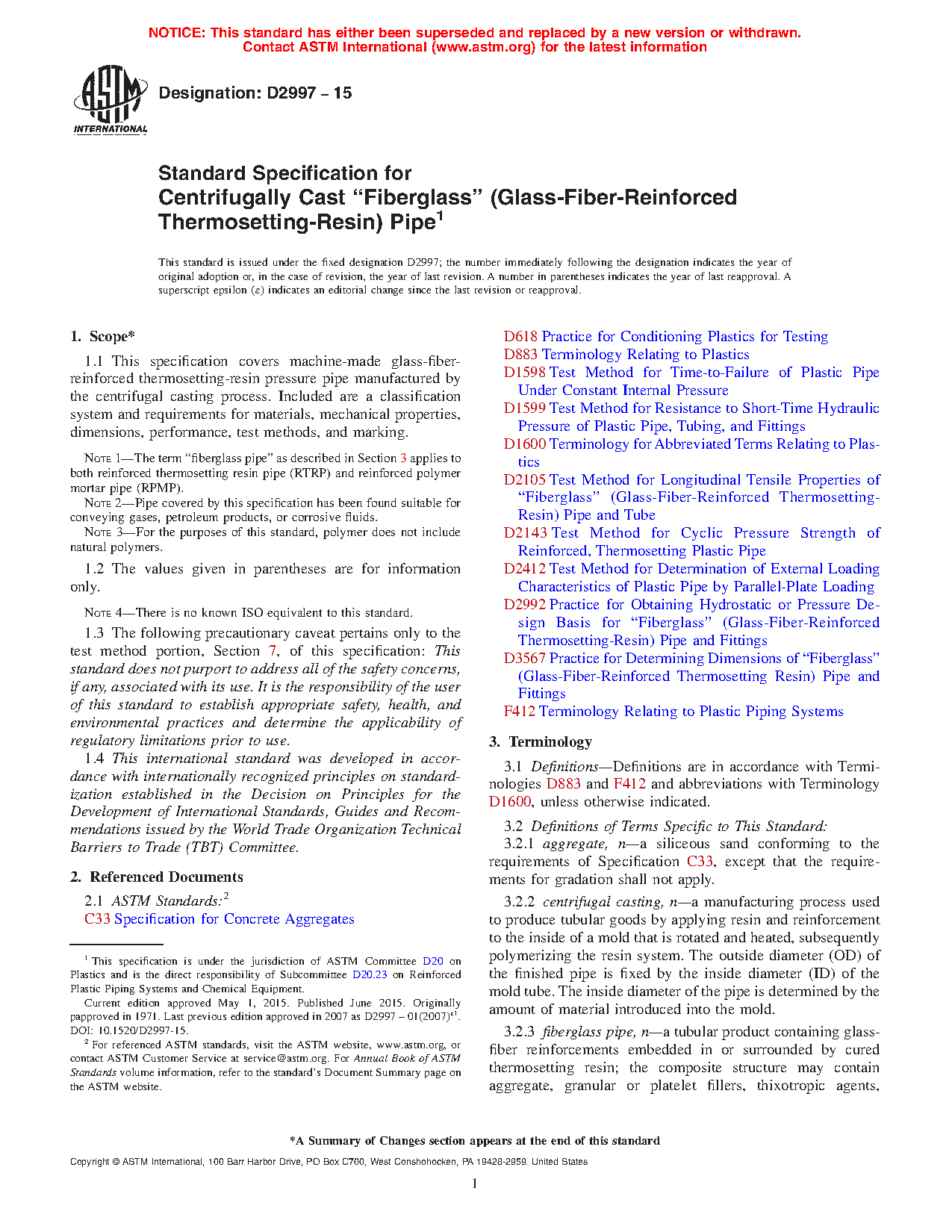 Note 1: The term “fiberglass pipe” as described in Section 3 applies to both reinforced thermosetting resin pipe (RTRP) and reinforced polymer mortar pipe (RPMP). Note 2: Pipe covered by this specification has been found suitable for conveying gases, petroleum products, or corrosive fluids.