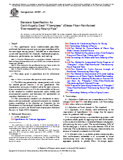 This specification covers machine-made glass-fiber-reinforced thermosetting-resin pressure pipe manufactured by the centrifugal casting process. Pipe covered by this specification has been found suitable for conveying gases, petroleum products, or corrosive fluids. For the purposes of this standard, polymer does not include natural polymers. Pipe meeting this specification shall be categorized by the prescribed long-term static or cyclic hydrostatic design basis when tested. Additionally, the pipe shall meet the applicable cell limit requirements for short-term rupture strength, longitudinal tensile strength, tensile modulus, and pipe stiffness.