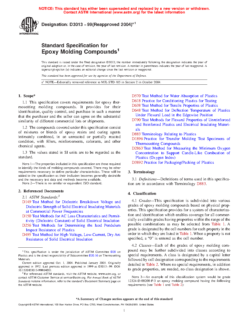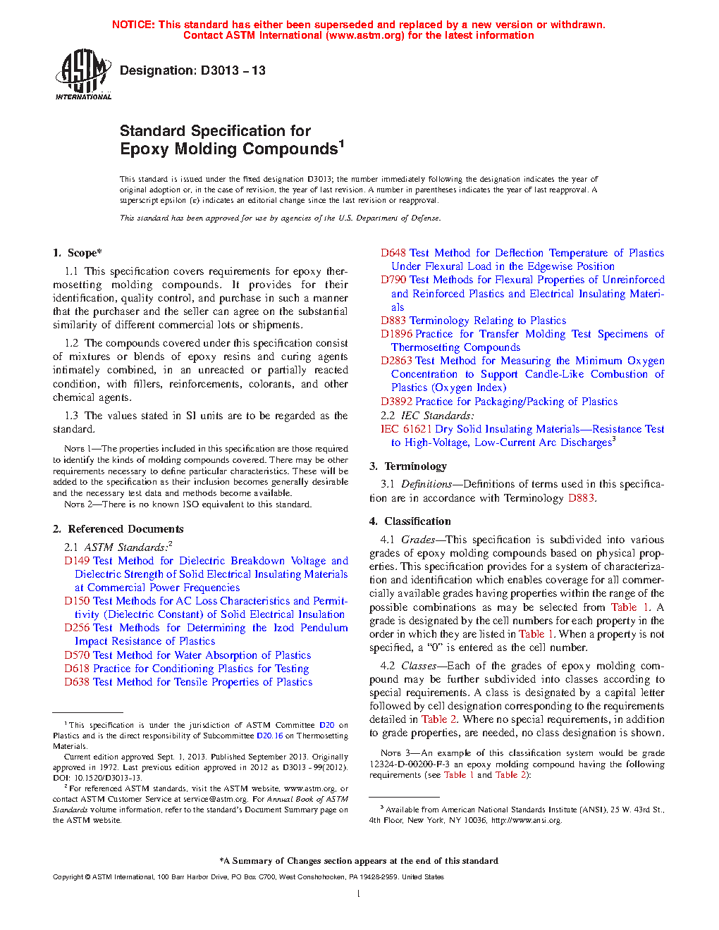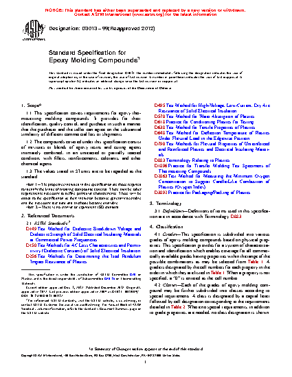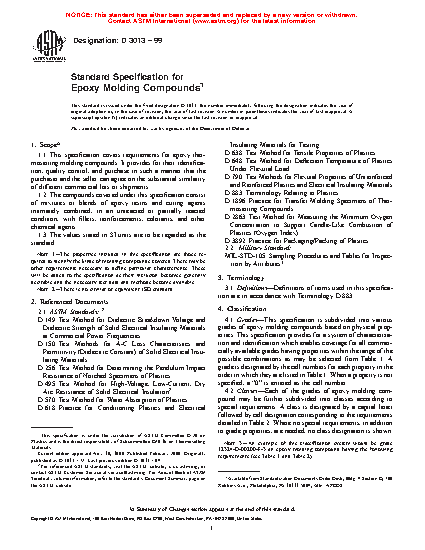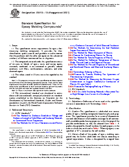 This specification covers the requirements for epoxy thermosetting molding compounds and provides for their identification, quality control, and purchase. Material covered in this specification consists of mixtures or blends of epoxy resins and curing agents intimately combined with fillers, reinforcements, colorants, and other chemical agents. The epoxy molding compounds are classified into grades based on physical properties, which may be further classified into classes (dielectric or flame retardant) according to special requirements. The molding compounds shall be manufactured with uniform composition and with the apparent density, bulk factor, flow, particle size, and Au: Pls. note that although caption make reference to color online, figures in print will appear in black and white. In conformity with the requirements specified. Tests for water absorption, flexural strength, impact resistance, tensile strength, deflection temperature under load, permittivity and dissipation factor, wet and dry dielectric strength, arc resistance, and flammability shall be performed and shall conform to the requirements specified.