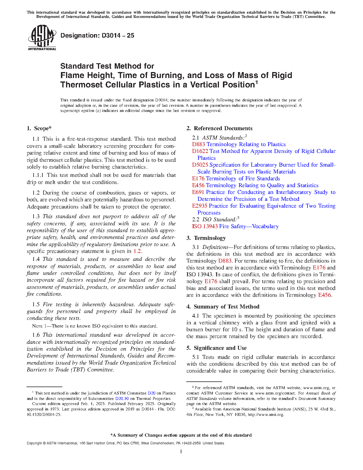 1.1 This is a fire-test-response standard. This test method covers a small-scale laboratory screening procedure for comparing relative extent and time of burning and loss of mass of rigid thermoset cellular plastics. This test method is to be used solely to establish relative burning characteristics.
