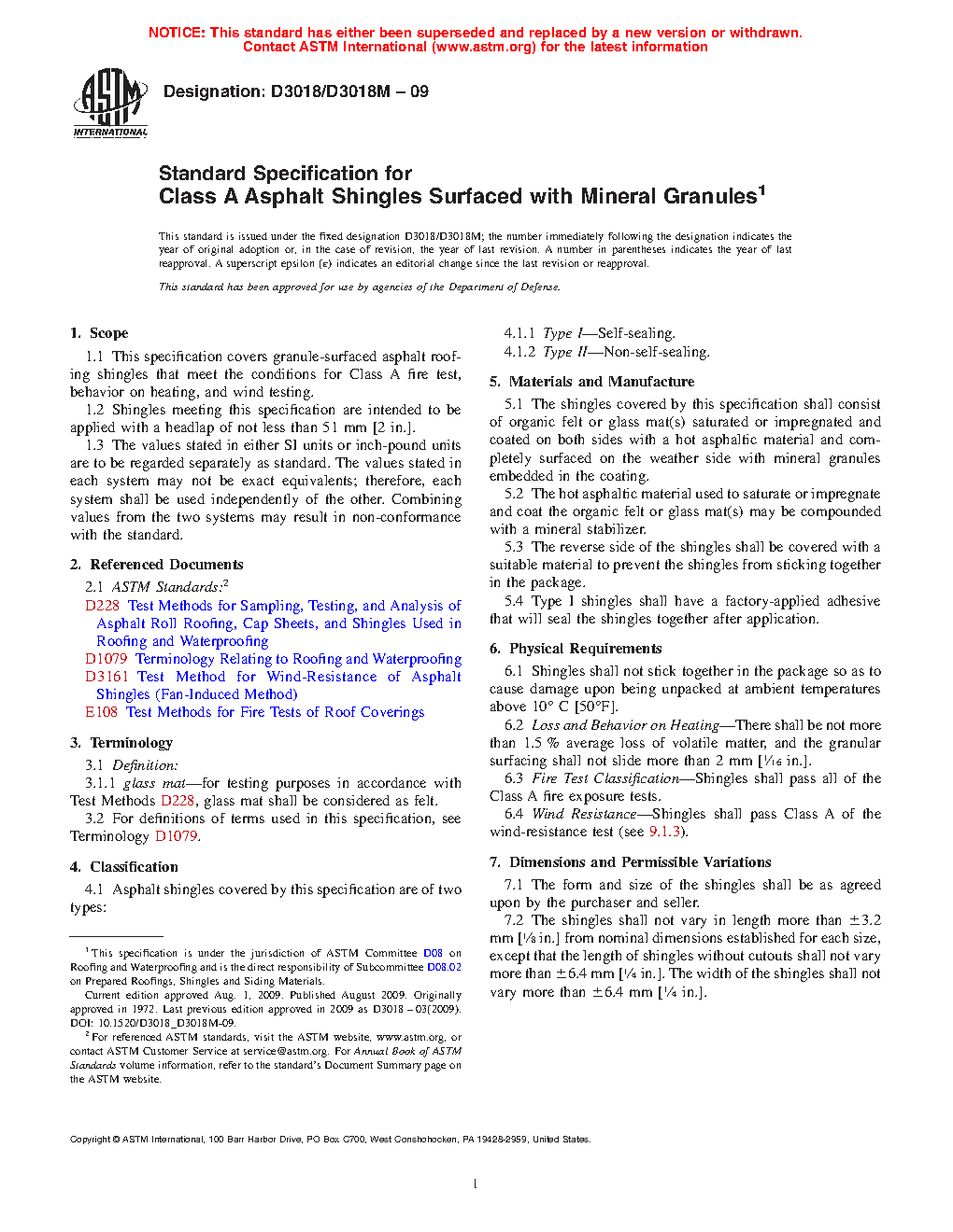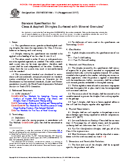 1.1 This specification covers granule-surfaced asphalt roofing shingles that meet the requirements for Class A fire test, behavior on heating, and wind testing.