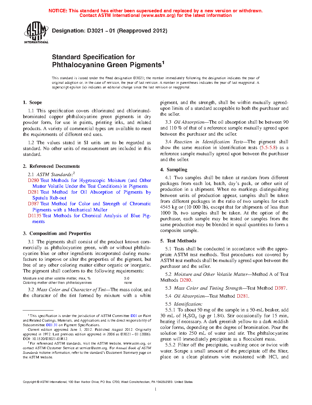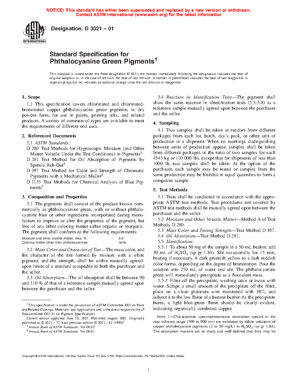This specification establishes the properties and requirements for chlorinated and chlorinated-brominated copper phthalocyanine green pigments in dry powder form, for use in paints, printing inks, and related products. The pigments may or may not phthalocyanine blue or other ingredients incorporated during manufacture to improve or alter the properties of the pigment, but free of any other coloring matter either organic or inorganic. Specimens shall be sampled and undergo tests as appropriate, and shall conform to the following properties: moisture and other volatile matter; mass color, tint character, and tinting strength; oil absorption; basic dye derivatives; chrome green and iron blue; and reaction in identification test.