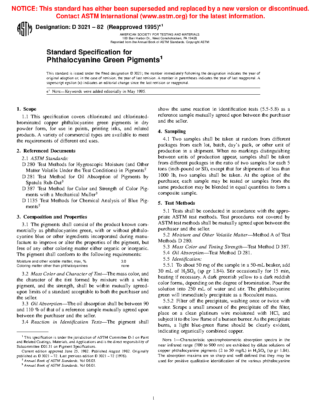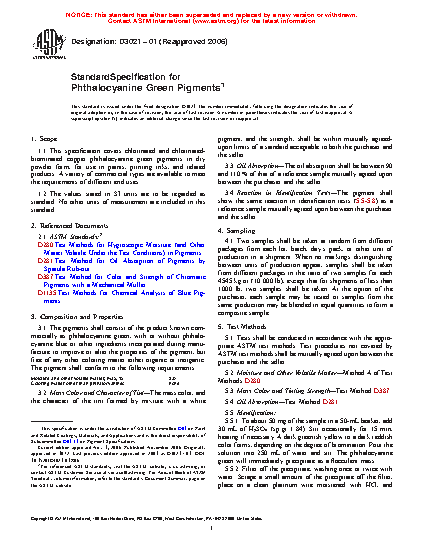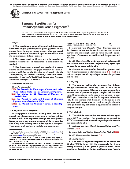 1.1 This specification covers chlorinated and chlorinated-brominated copper phthalocyanine green pigments in dry powder form, for use in paints, printing inks, and related products. A variety of commercial types are available to meet the requirements of different end uses.