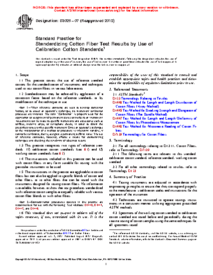 1.1 This practice covers the use of reference standard cottons for the standardization of instruments and techniques used to test cotton fibers in various laboratories.