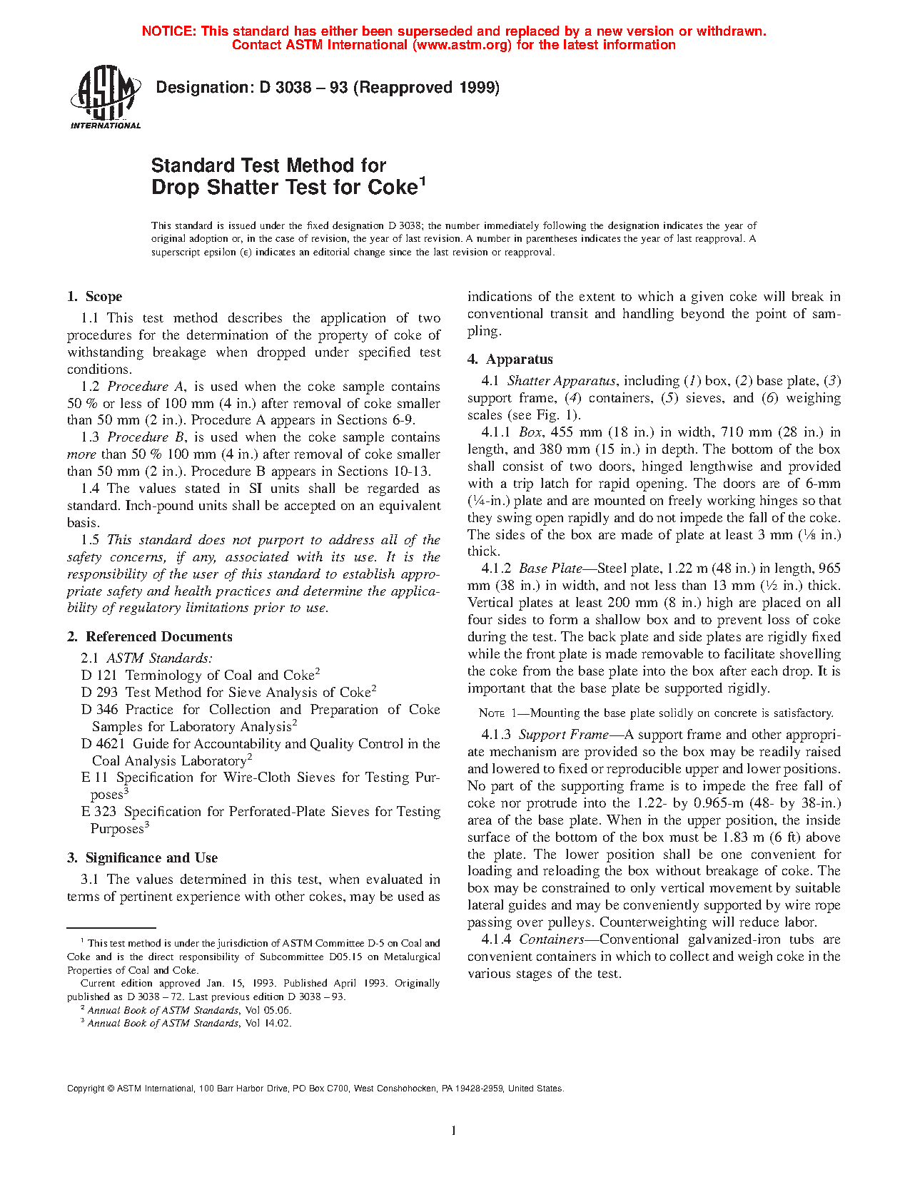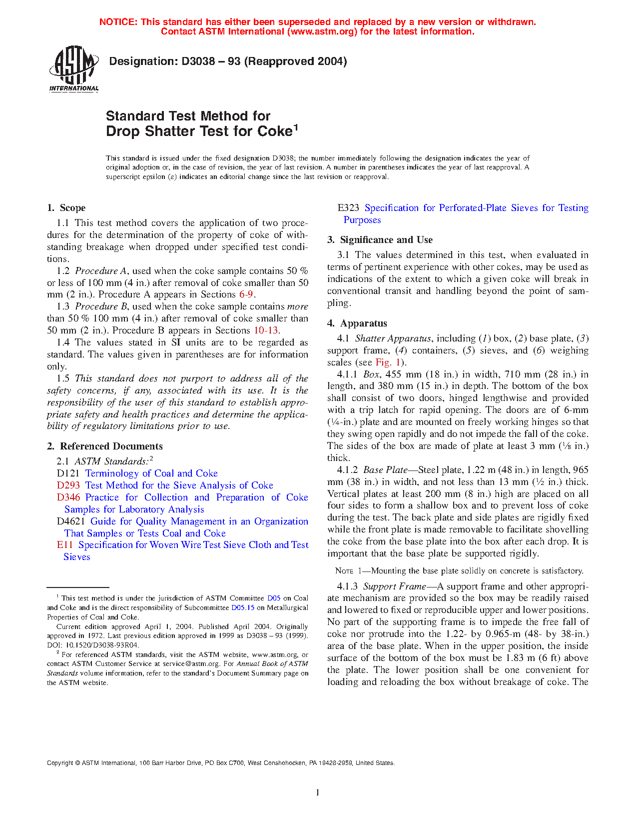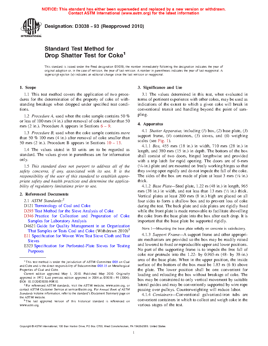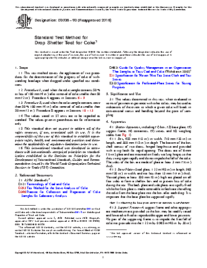 1.1 This test method covers the application of two procedures for the determination of the property of coke of withstanding breakage when dropped under specified test conditions.