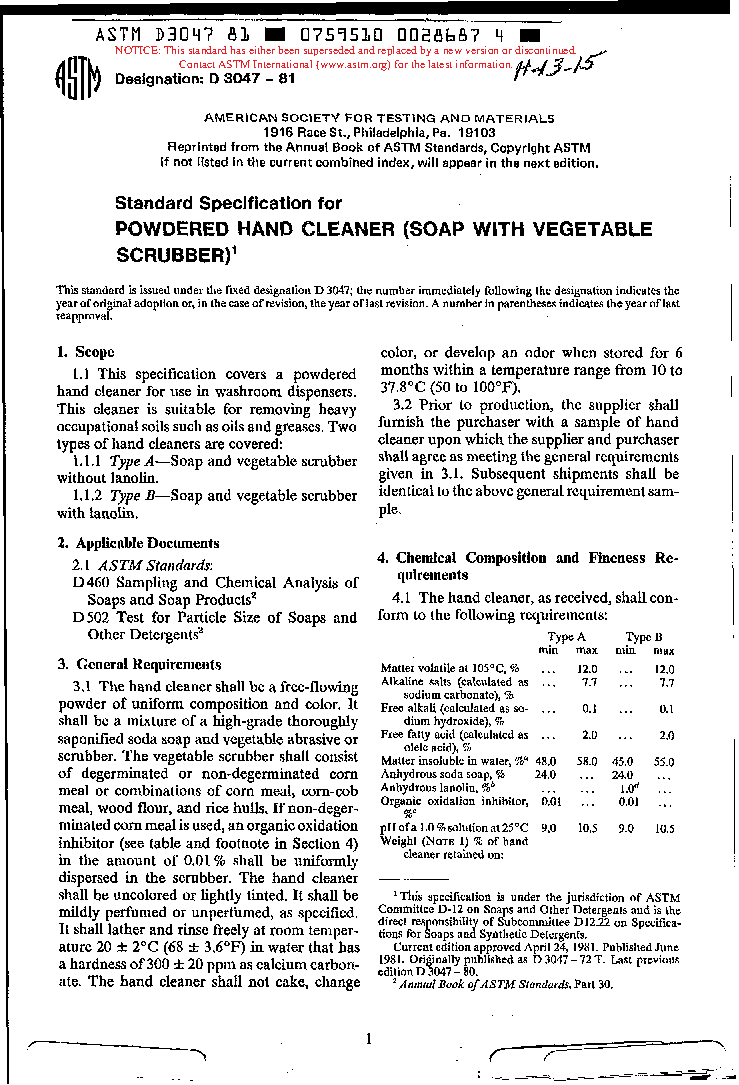 Standard Specification for Powdered Hand Cleaner (Soap with Vegetable Scrubber)