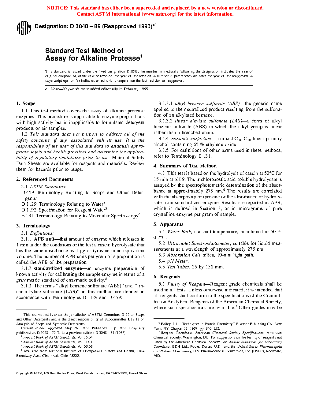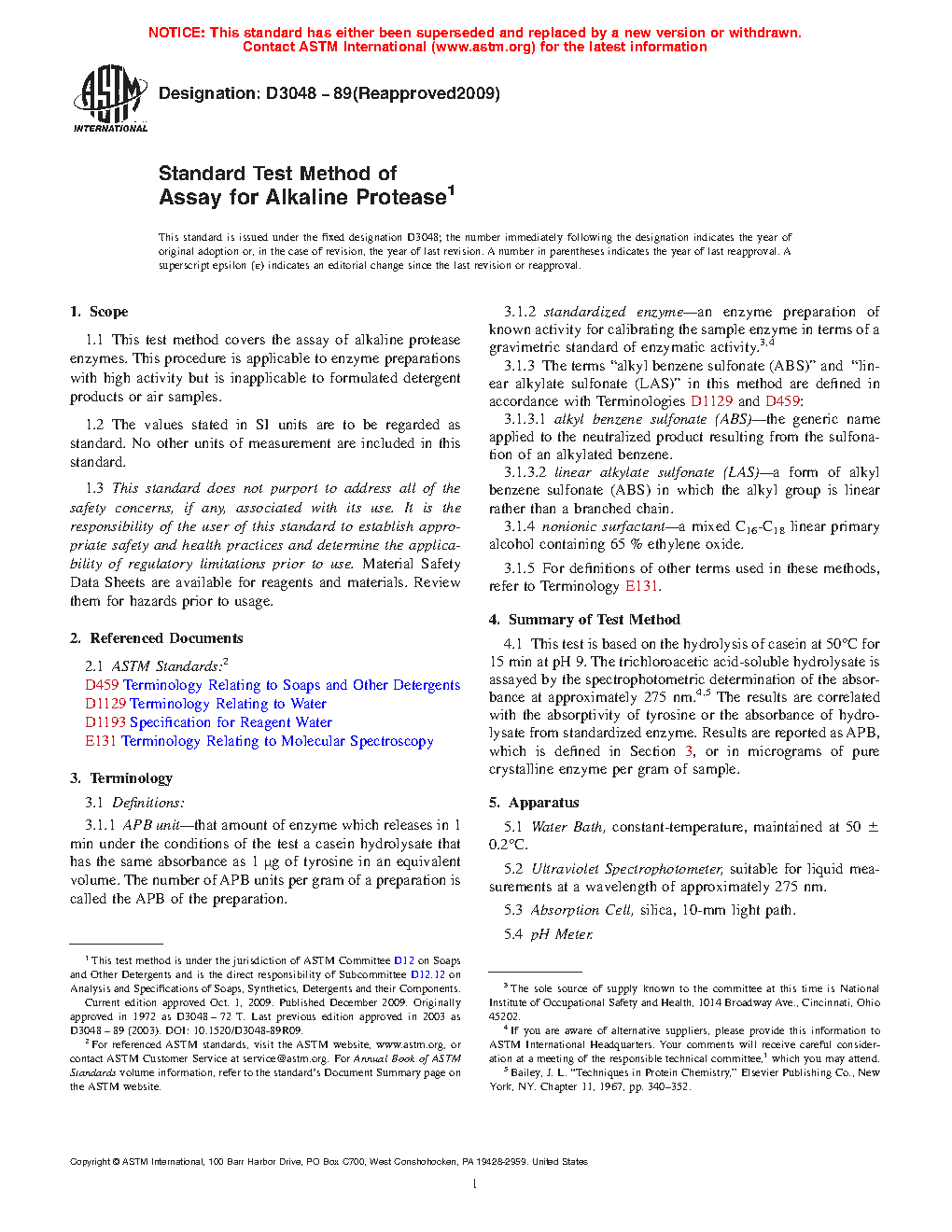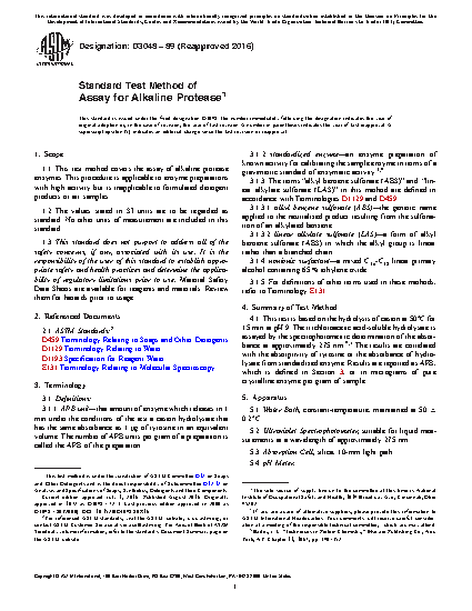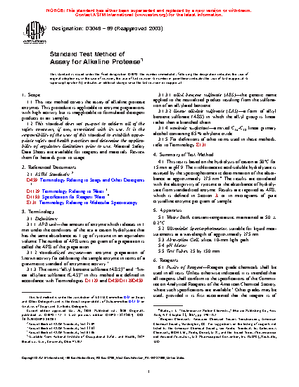 1.1 This test method covers the assay of alkaline protease enzymes. This procedure is applicable to enzyme preparations with high activity but is inapplicable to formulated detergent products or air samples.
