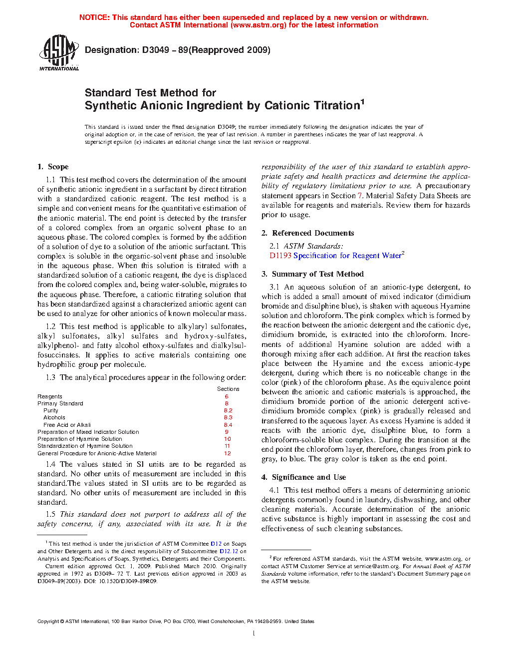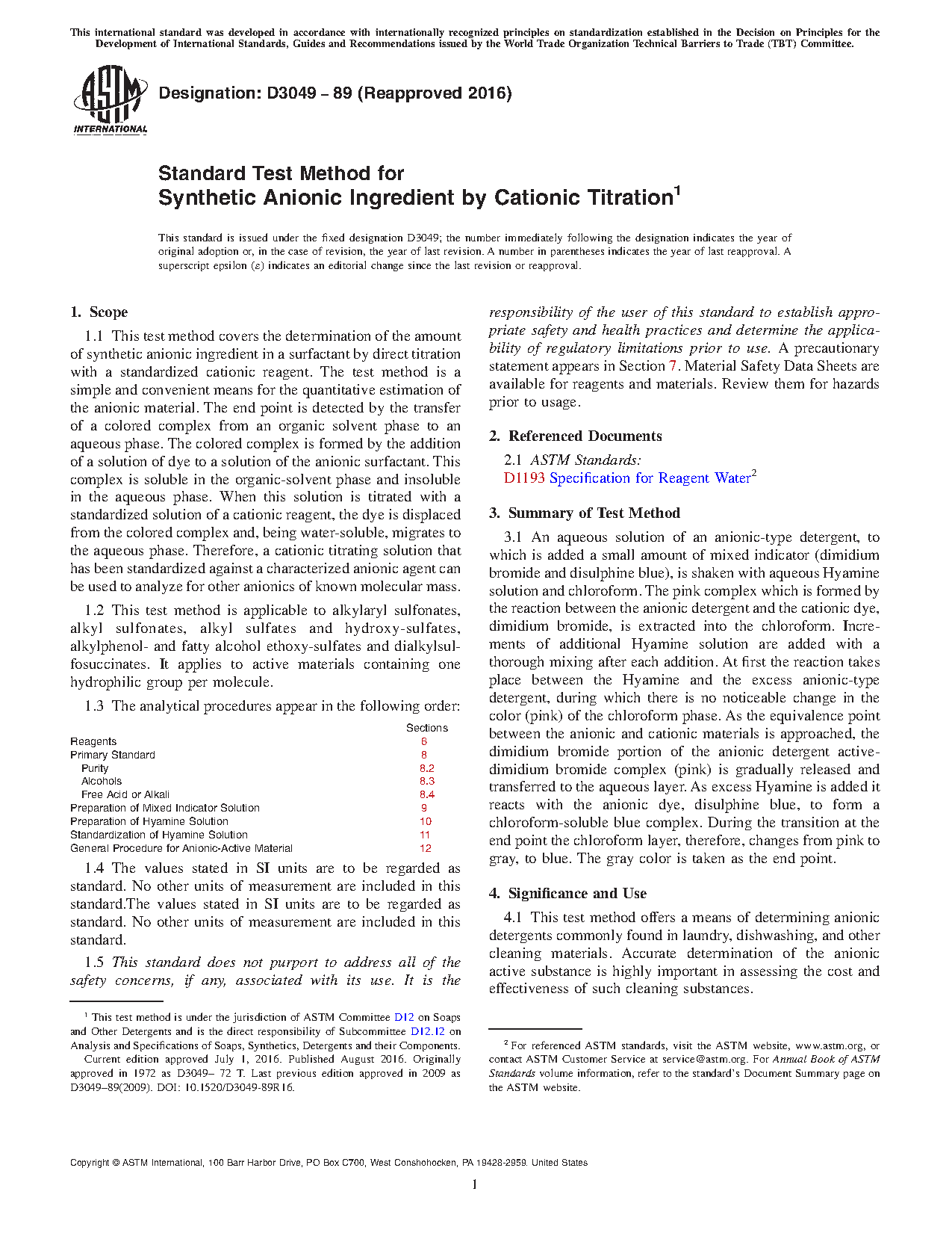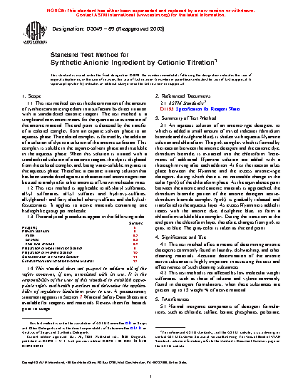 This test method offers a means of determining anionic detergents commonly found in laundry, dishwashing, and other cleaning materials. Accurate determination of the anionic active substance is highly important in assessing the cost and effectiveness of such cleaning substances.