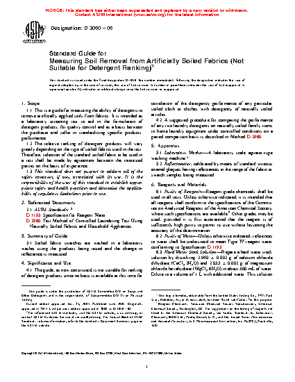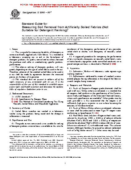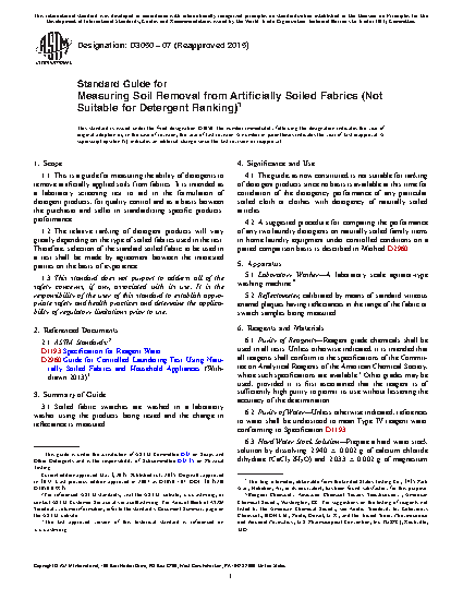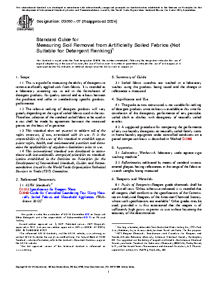 1.1 This is a guide for measuring the ability of detergents to remove artificially applied soils from fabrics. It is intended as a laboratory screening test to aid in the formulation of detergent products, for quality control and as a basis between the purchaser and seller in standardizing specific products' performance.