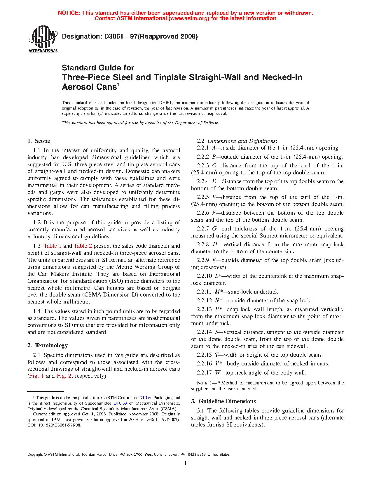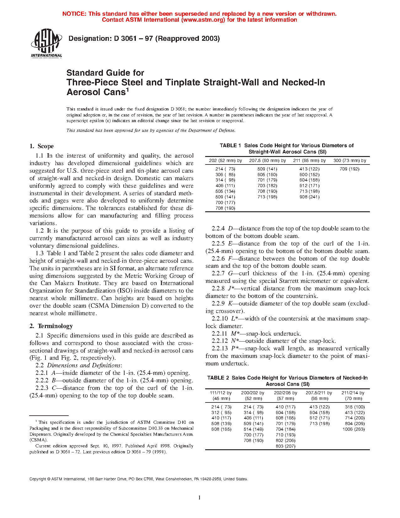 This guide establishes the dimensional guidelines for U.S. three-piece steel and tin-plate aerosol cans of straight-wall and necked-in designs. It is the purpose of this guide to provide a listing of currently manufactured aerosol can sizes as well as industry voluntary dimensional guidelines. Presented here are the sales code diameter and height of straight-wall and necked-in three-piece aerosol cans. Also provided here are the straight-wall aerosol can heights and curl dimensions, comparable information for necked-in aerosol cans, and the dimensions of top end and body which are critical for overcap fit. The tolerances established for these dimensions allow for can manufacturing and filling process variations.
