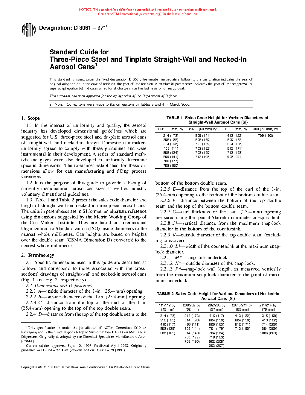 1.3 Table 1 and Table 2 present the sales code diameter and height of straight-wall and necked-in three-piece aerosol cans. The units in parentheses are in SI format, an alternate reference using dimensions suggested by the Metric Working Group of the Can Makers Institute. They are based on International Organization for Standardization (ISO) inside diameters to the nearest whole millimetre. Can heights are based on heights over the double seam (CSMA Dimension D) converted to the nearest whole millimetre.