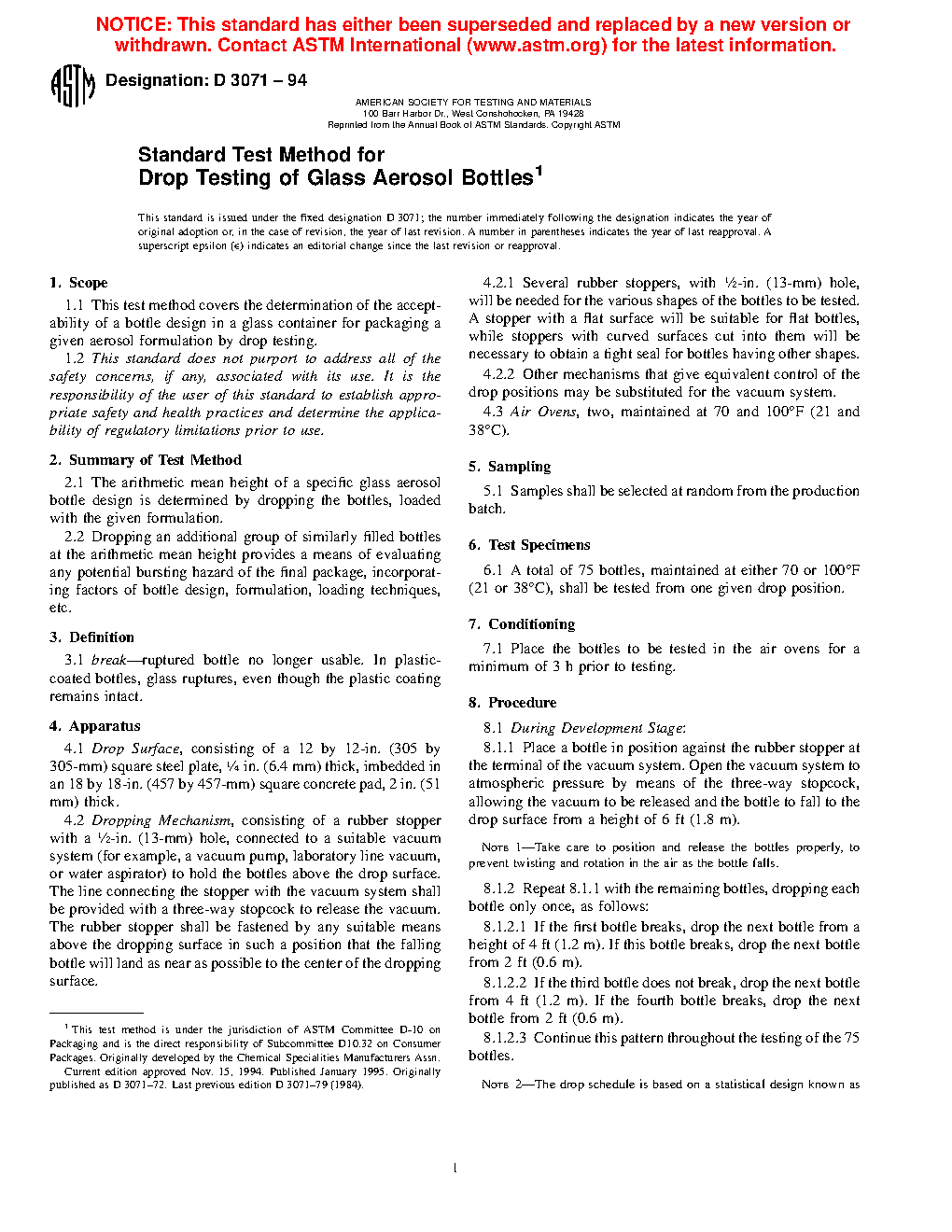 Standard Test Method for Drop Testing of Glass Aerosol Bottles (Withdrawn 2000)