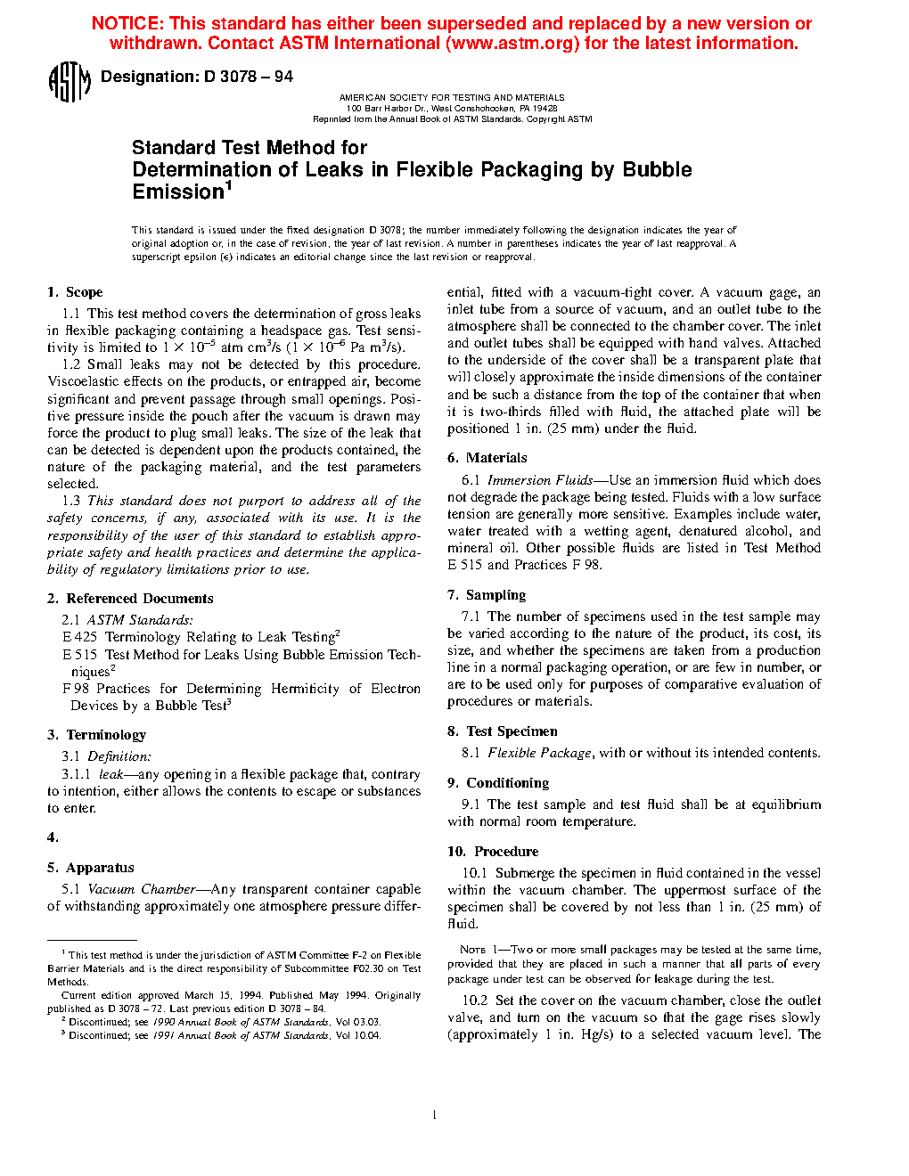 This test method covers the determination of gross leaks in flexible packaging containing a headspace gas by bubble emission. A vacuum chamber shall be any transparent container capable of withstanding approximately one atmosphere pressure differential, fitted with a vacuum-tight cover. A vacuum gage, an inlet tube from a source of vacuum, and an outlet tube to the atmosphere shall be connected to the chamber cover. Use an immersion fluid which does not degrade the package being tested. The test sample and test fluid shall be at equilibrium with normal room temperature. The procedures for testing are presented in details.