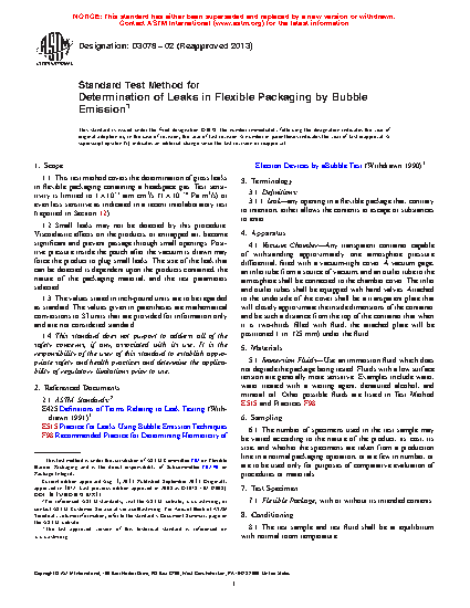 1.1 This test method covers the determination of gross leaks in flexible packaging containing a headspace gas. Test sensitivity is limited to 1 × 10-5 atm cm3/s (1 × 10-6 Pa m3/s) or even less sensitive as indicated in a recent interlaboratory test (reported in Section 12).
