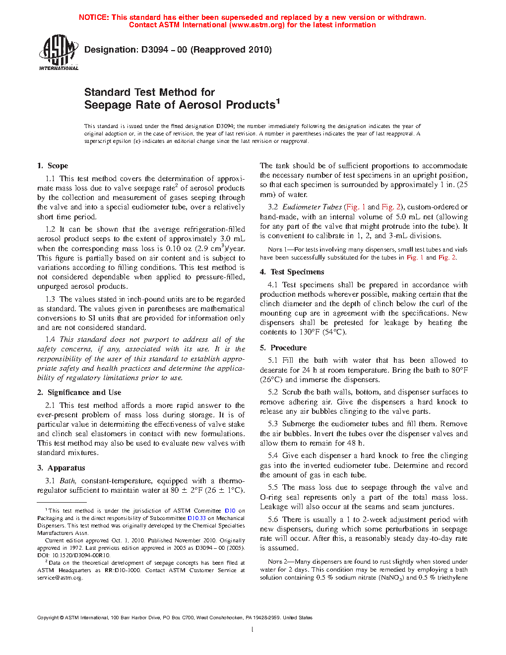 1.2 It can be shown that the average refrigeration-filled aerosol product seeps to the extent of approximately 3.0 mL when the corresponding mass loss is 0.10 oz (2.9 cm3)/year. This figure is partially based on air content and is subject to variations according to filling conditions. This practice is not considered dependable when applied to pressure-filled, unpurged aerosol products.