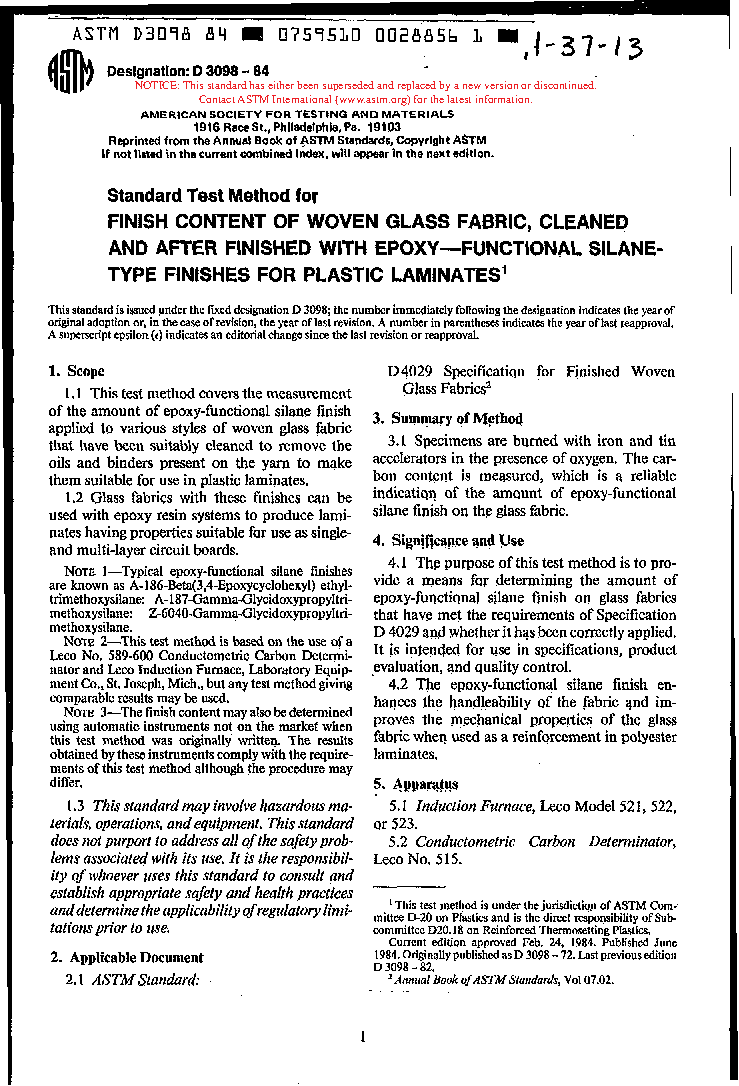 Method of Test for Finish Content of Woven Glass Fabrics, Cleaned and After-Finished with Epoxy-Functions Silane Type Finishes for Plastic Laminates (Withdrawn 1988)