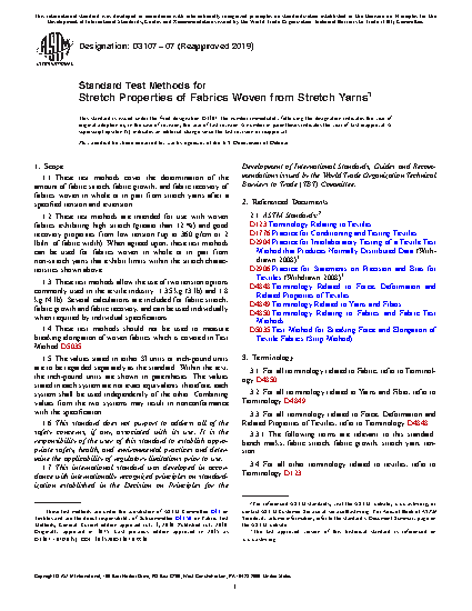 1.1 These test methods cover the determination of the amount of fabric stretch, fabric growth, and fabric recovery of fabrics woven in whole or in part from stretch yarns after a specified tension and extension.