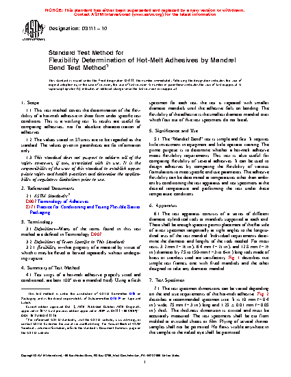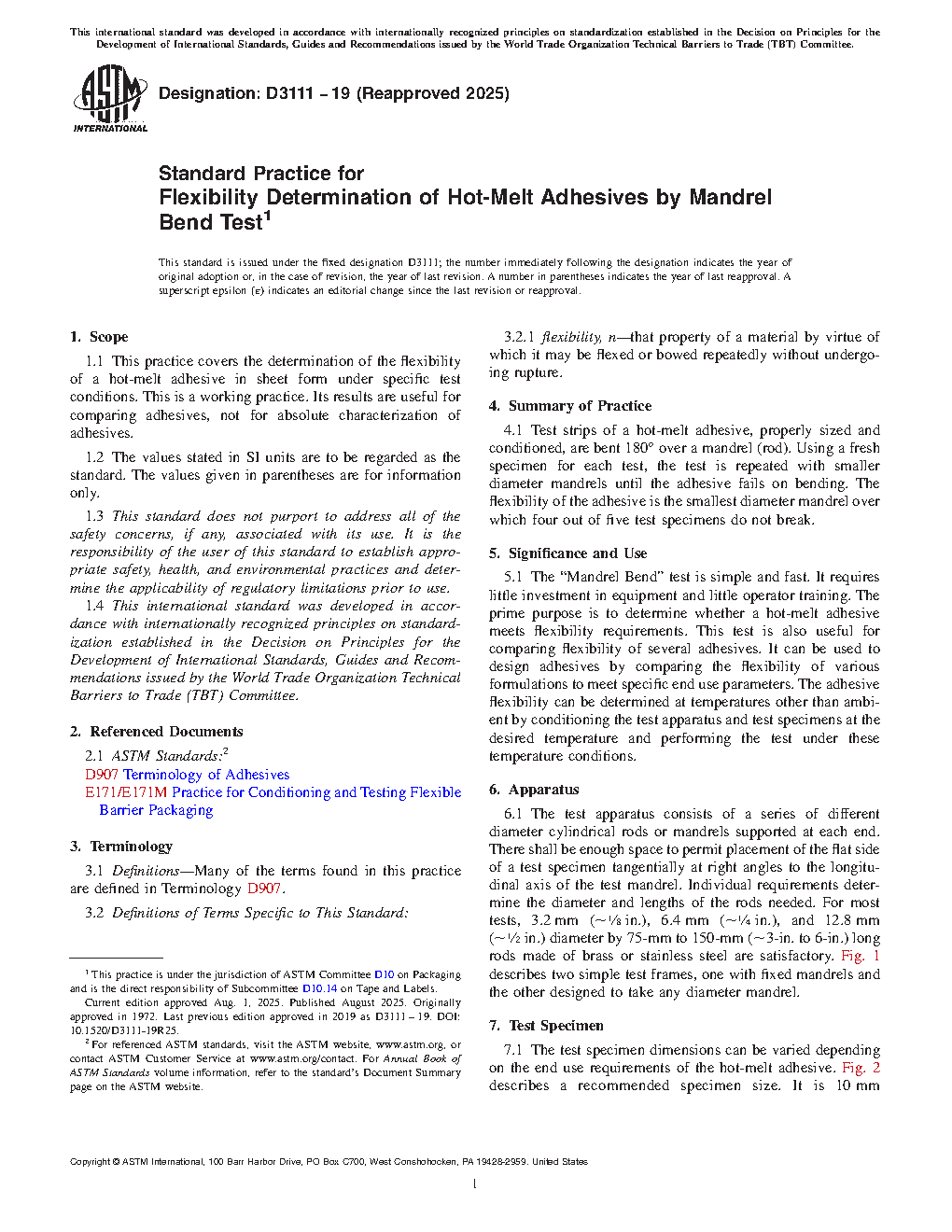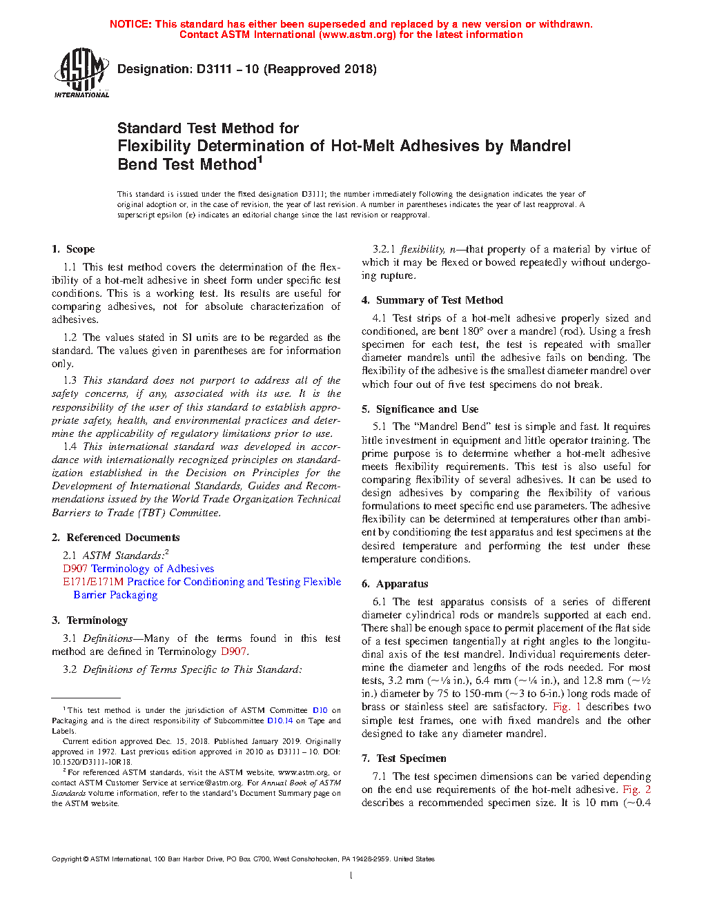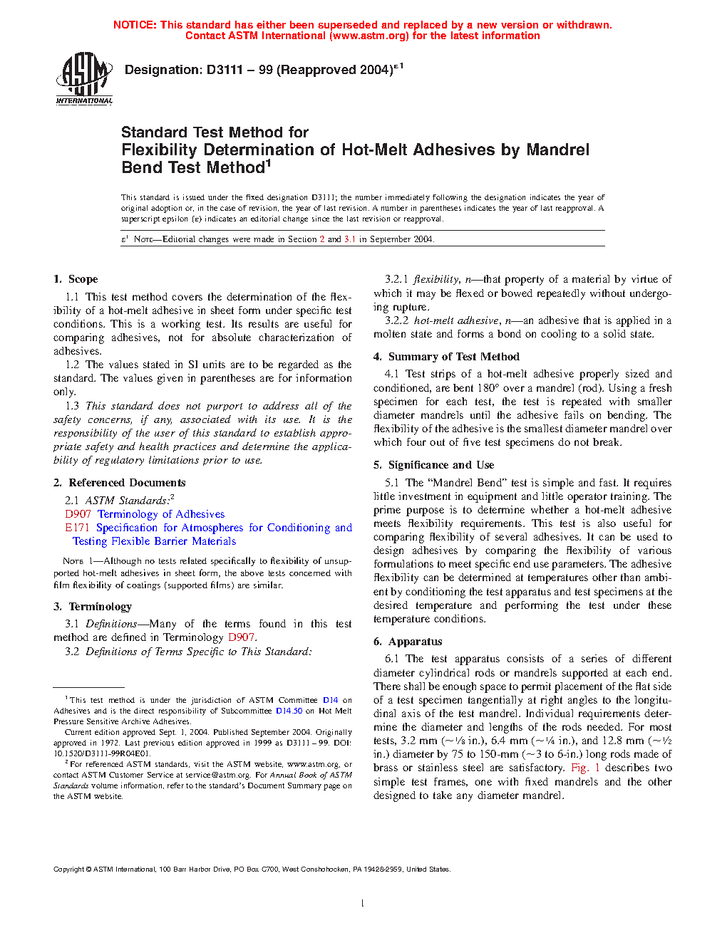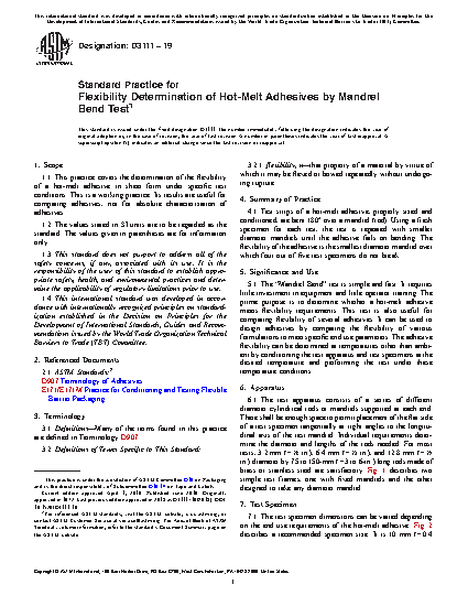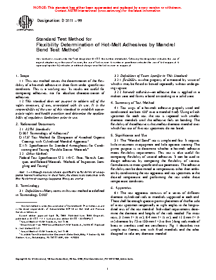 5.1 The “Mandrel Bend” test is simple and fast. It requires little investment in equipment and little operator training. The prime purpose is to determine whether a hot-melt adhesive meets flexibility requirements. This test is also useful for comparing flexibility of several adhesives. It can be used to design adhesives by comparing the flexibility of various formulations to meet specific end use parameters. The adhesive flexibility can be determined at temperatures other than ambient by conditioning the test apparatus and test specimens at the desired temperature and performing the test under these temperature conditions.