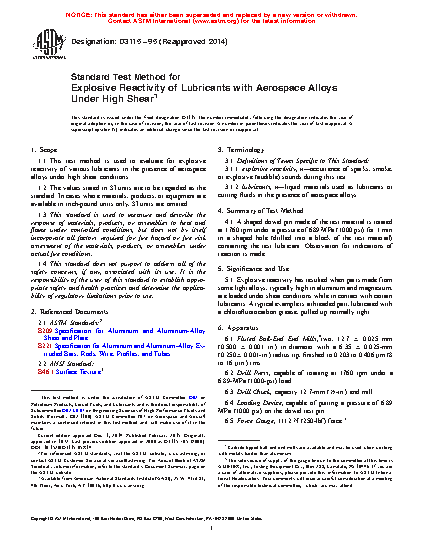 1.1 This test method is used to evaluate for explosive reactivity of various lubricants in the presence of aerospace alloys under high shear conditions.