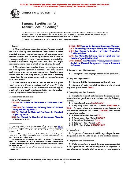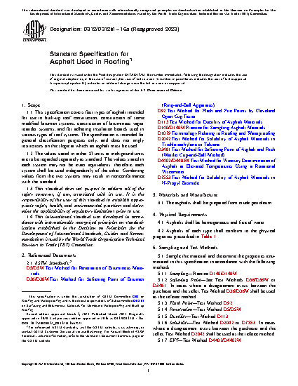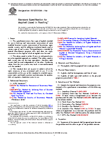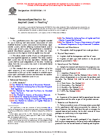 This specification covers four types of asphalt intended for use in built-up roof construction, construction of some modified bitumen systems, construction of bituminous vapor retarder systems, and for adhering insulation boards used in various types of roof systems. The asphalts shall be prepared from crude petroleum. Asphalts shall be classified as: Type I; Type II; Type III; and Type IV. Asphalts of each type shall conform to the physical properties prescribed. Tests shall be performed to determine the properties of the material in accordance with the following methods: sampling; softening point; flash point; penetration; ductility; and solubility.