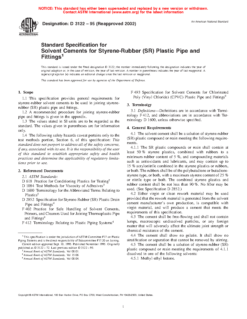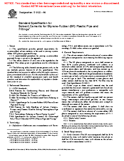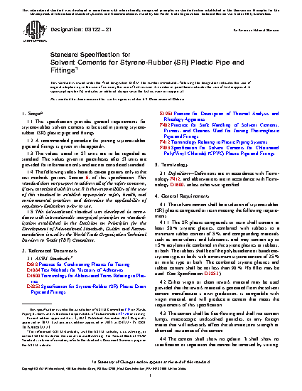 This specification provides general requirements for styrene-rubber solvent cements used in joining styrene-rubber (SR) plastic pipe and fittings. A recommended procedure for joining styrene-rubber pipe and fittings is given. The materials shall meet the required resin content, dissolution, viscosity, and lap shear strength.