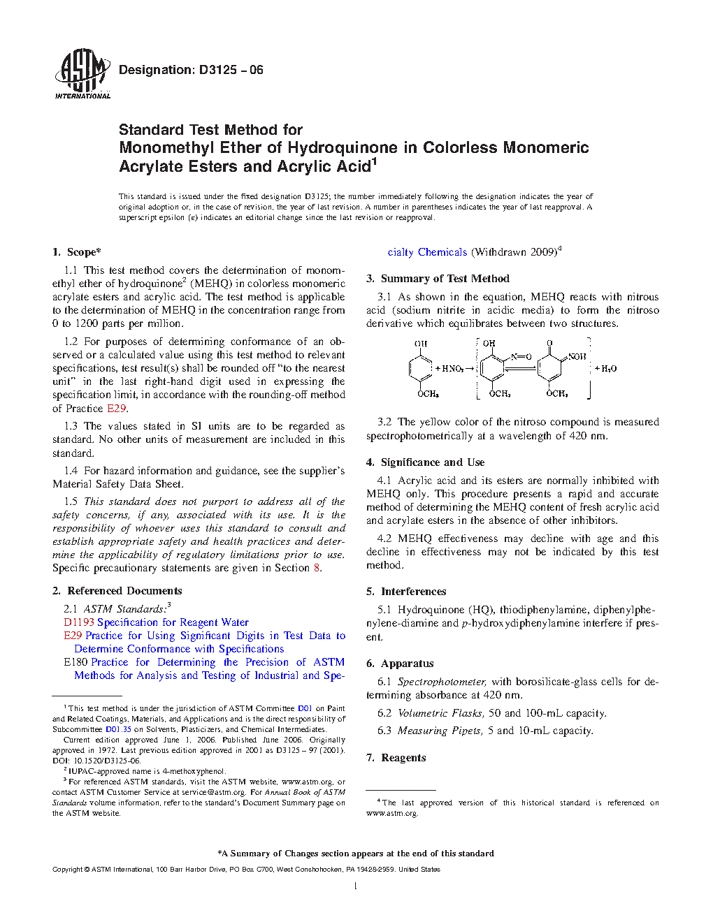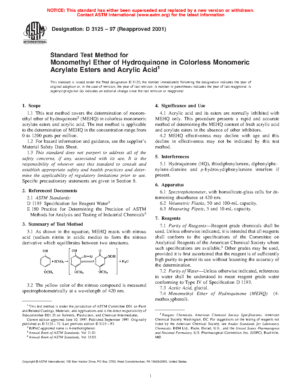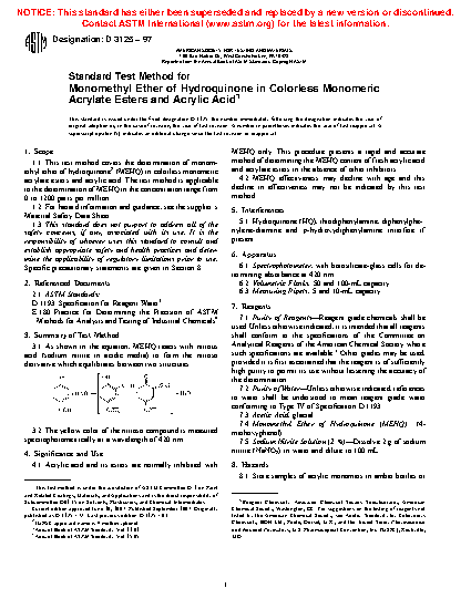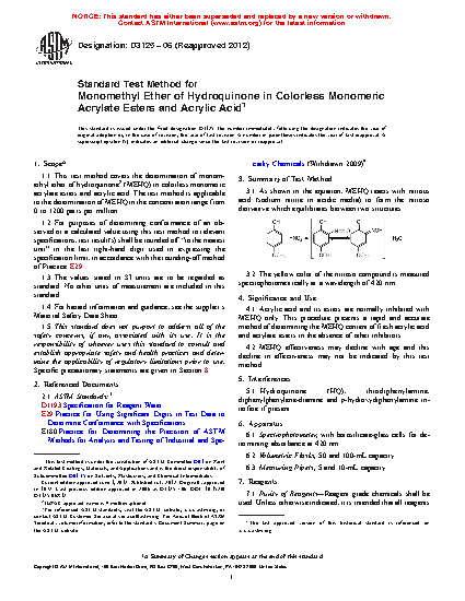 1.1 This test method covers the determination of monomethyl ether of hydroquinone (MEHQ) in colorless monomeric acrylate esters and acrylic acid. The test method is applicable to the determination of MEHQ in the concentration range from 0 to 1200 parts per million.