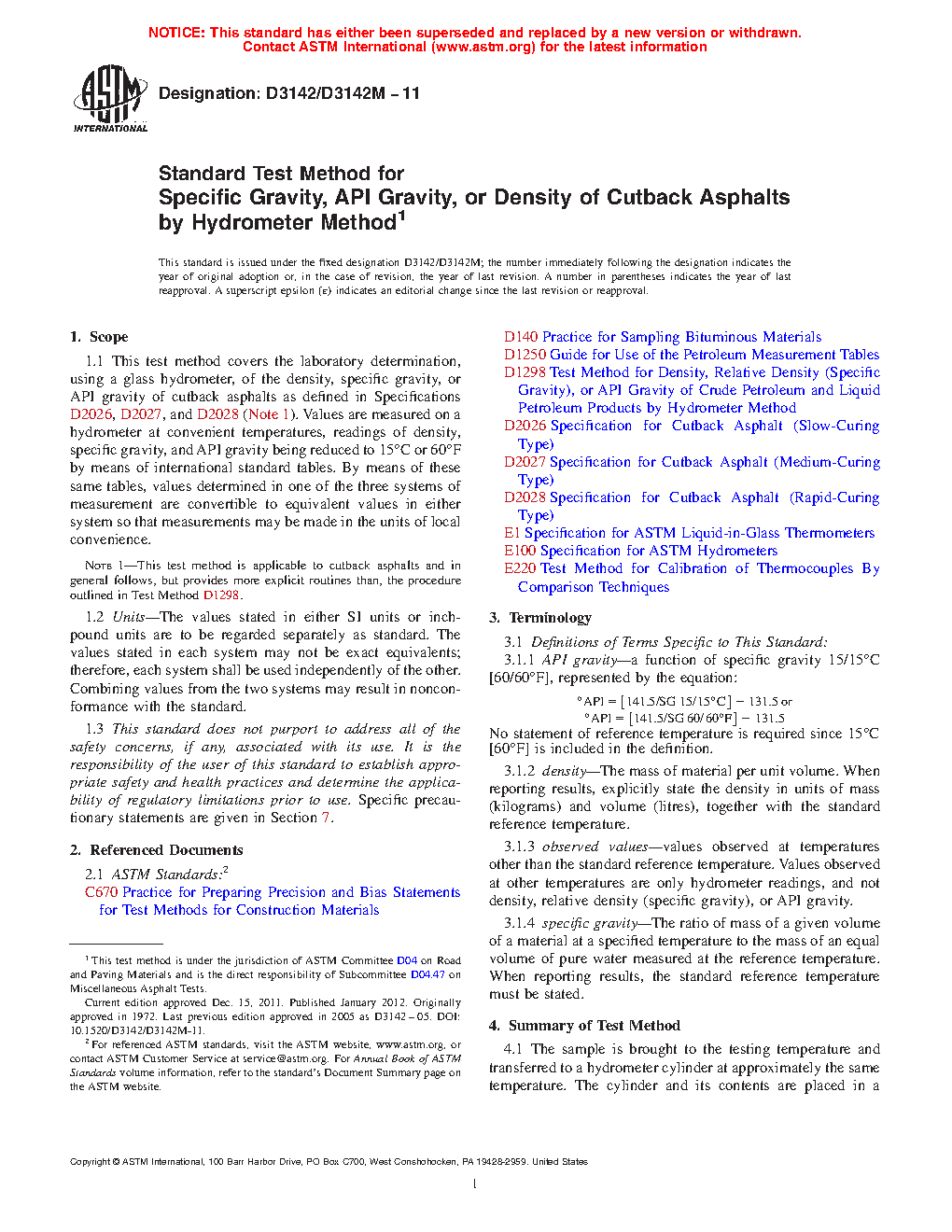 1.1 This test method covers the laboratory determination, using a glass hydrometer, of the density, specific gravity, or API gravity of cutback asphalts as defined in Specifications D2026/D2026M, D2027/D2027M, and D2028/D2028M (Note 1). Values are measured on a hydrometer at convenient temperatures, readings of density, specific gravity, and API gravity being reduced to 15 °C or 60 °F by means of international standard tables. By means of these same tables, values determined in one of the three systems of measurement are convertible to equivalent values in either system so that measurements may be made in the units of local convenience.