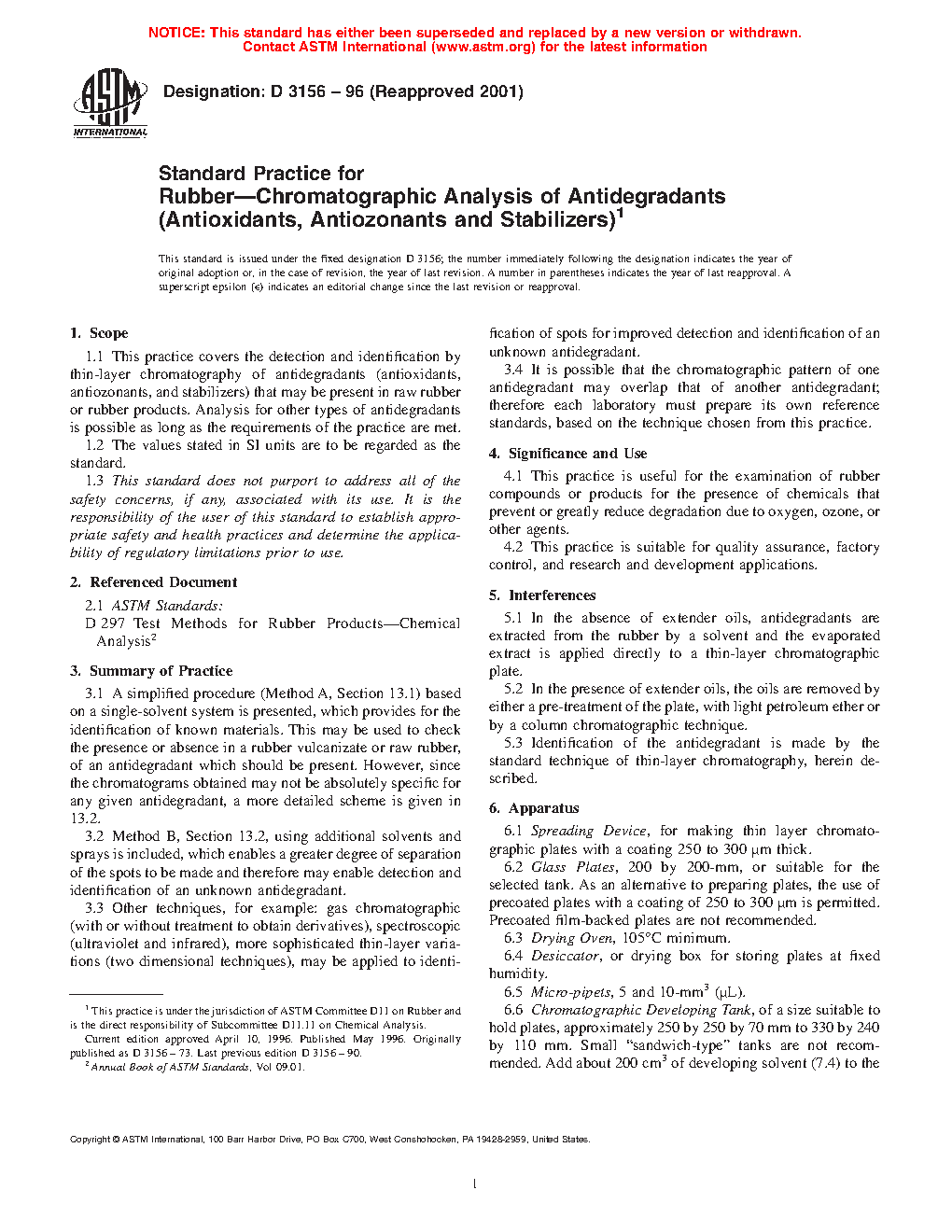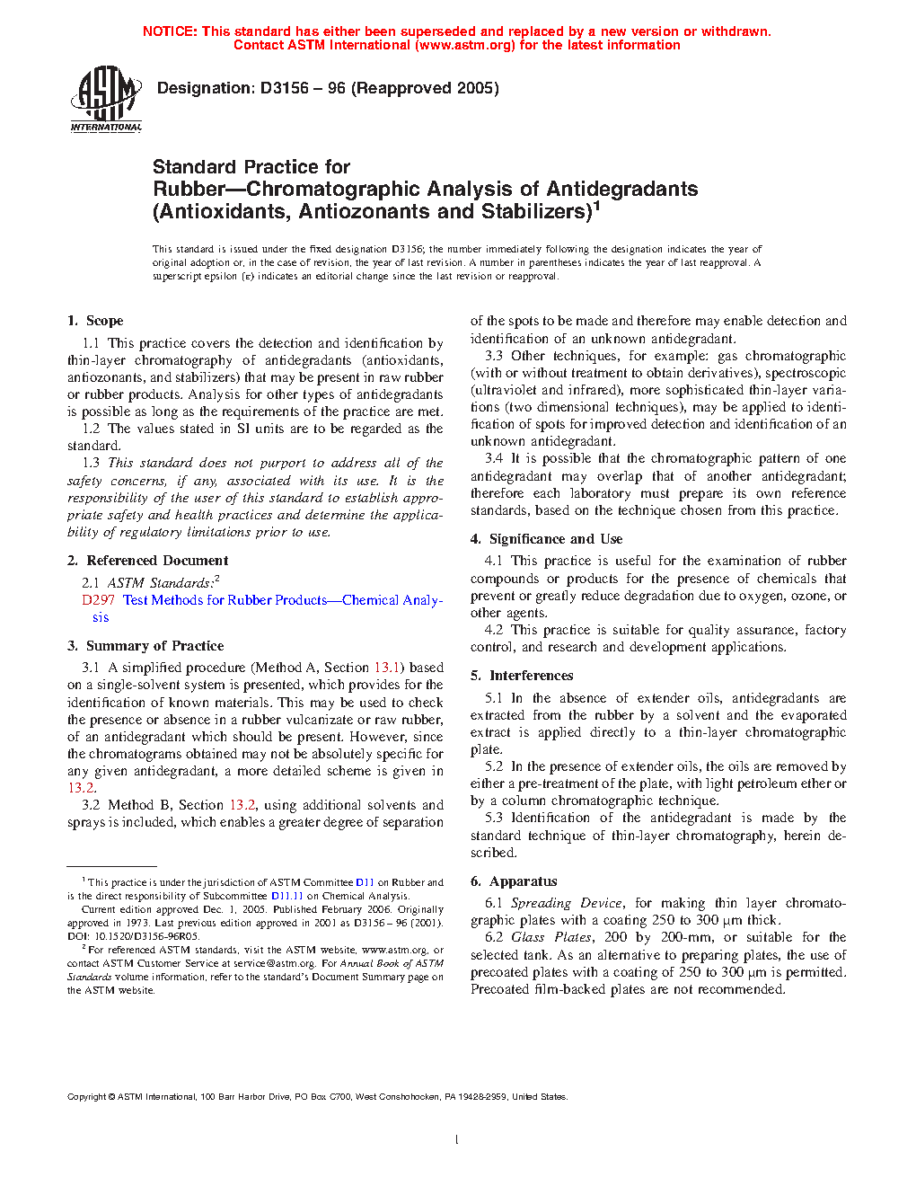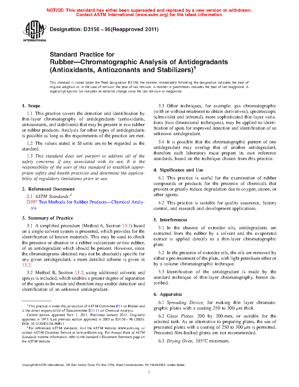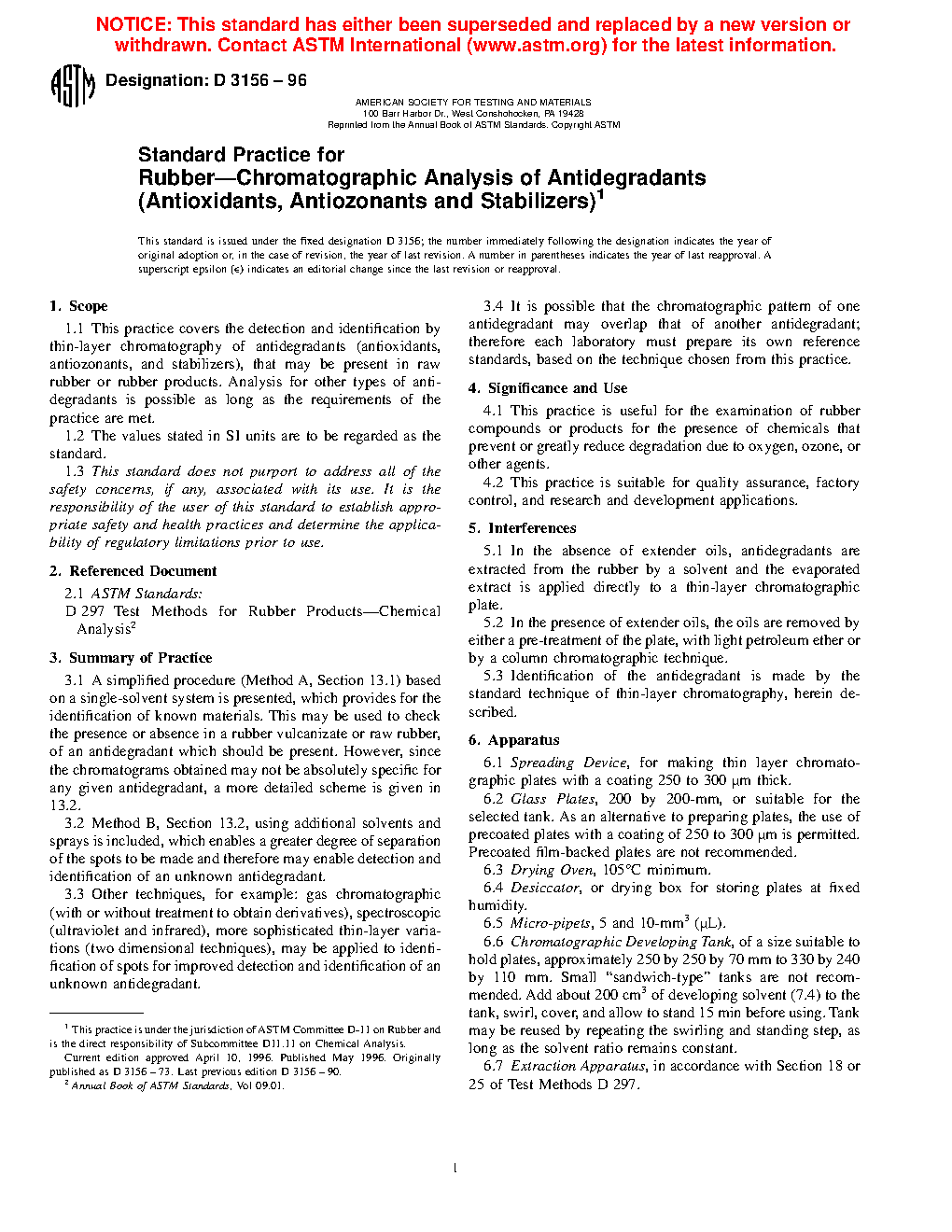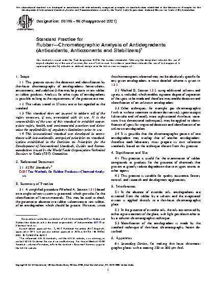 1.1 This practice covers the detection and identification by thin-layer chromatography of antidegradants (antioxidants, antiozonants, and stabilizers) that may be present in raw rubber or rubber products. Analysis for other types of antidegradants is possible as long as the requirements of the practice are met.