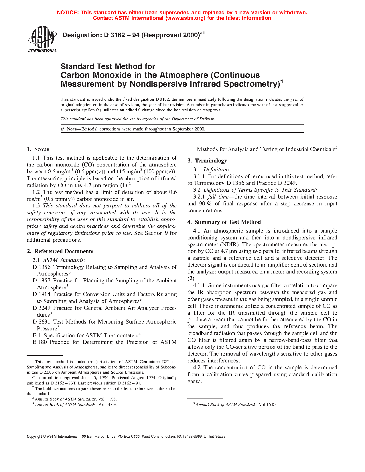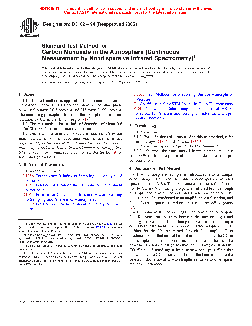 1.1 This test method is applicable to the determination of the carbon monoxide (CO) concentration of the atmosphere between 0.6 mg/m3 (0.5 ppm(v)) and 115 mg/m3 (100 ppm(v)). The measuring principle is based on the absorption of infrared radiation by CO in the 4.7 µm region (1).2