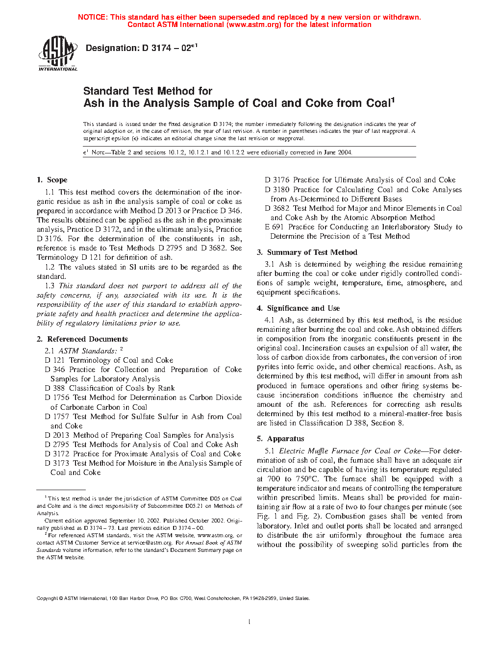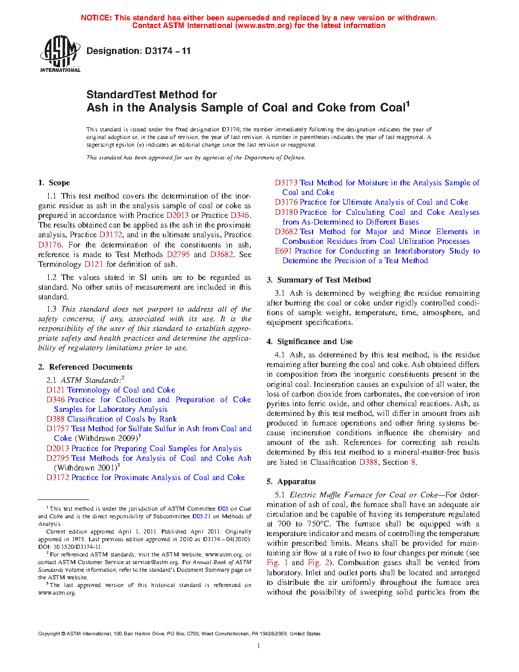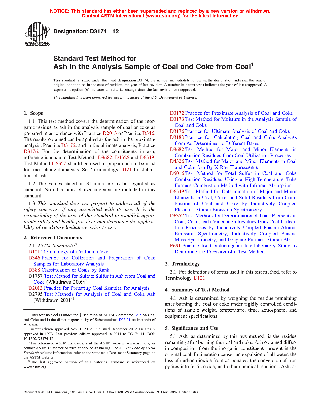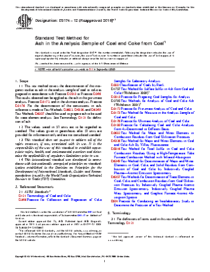1.1 This test method covers the determination of the inorganic residue as ash in the analysis sample of coal or coke as prepared in accordance with Practice D2013 or Practice D346. The results obtained can be applied as the ash in the proximate analysis, Practice D3172, and in the ultimate analysis, Practice D3176. For the determination of the constituents in ash, reference is made to Test Methods D3682, D4326, and D6349. Test Methods D6357 should be used to prepare ash to be used for trace element analysis. See Terminology D121 for definition of ash.