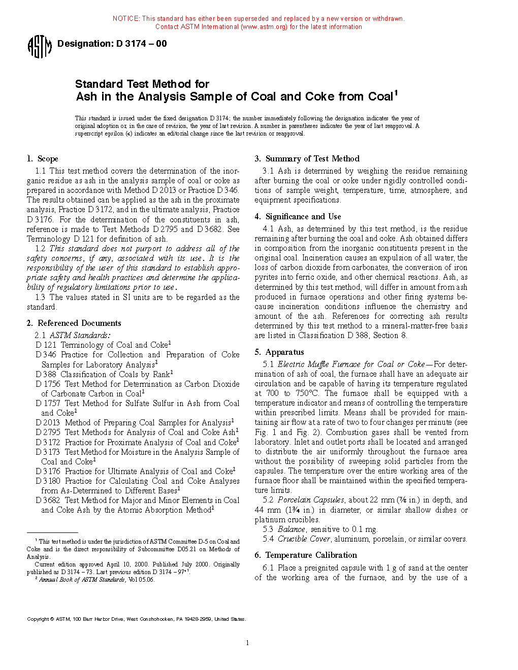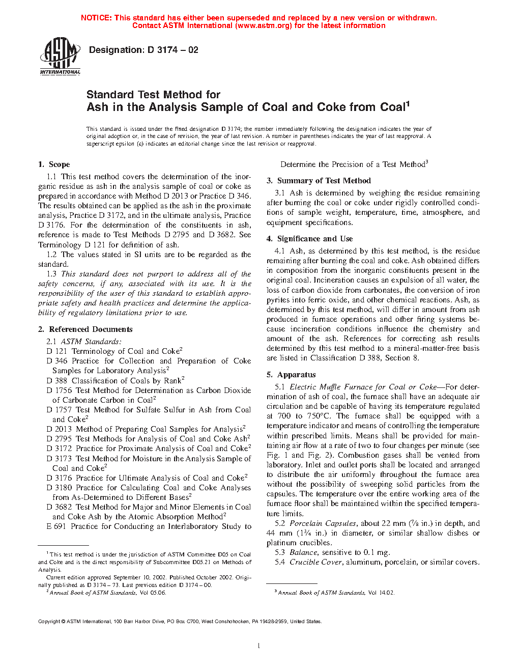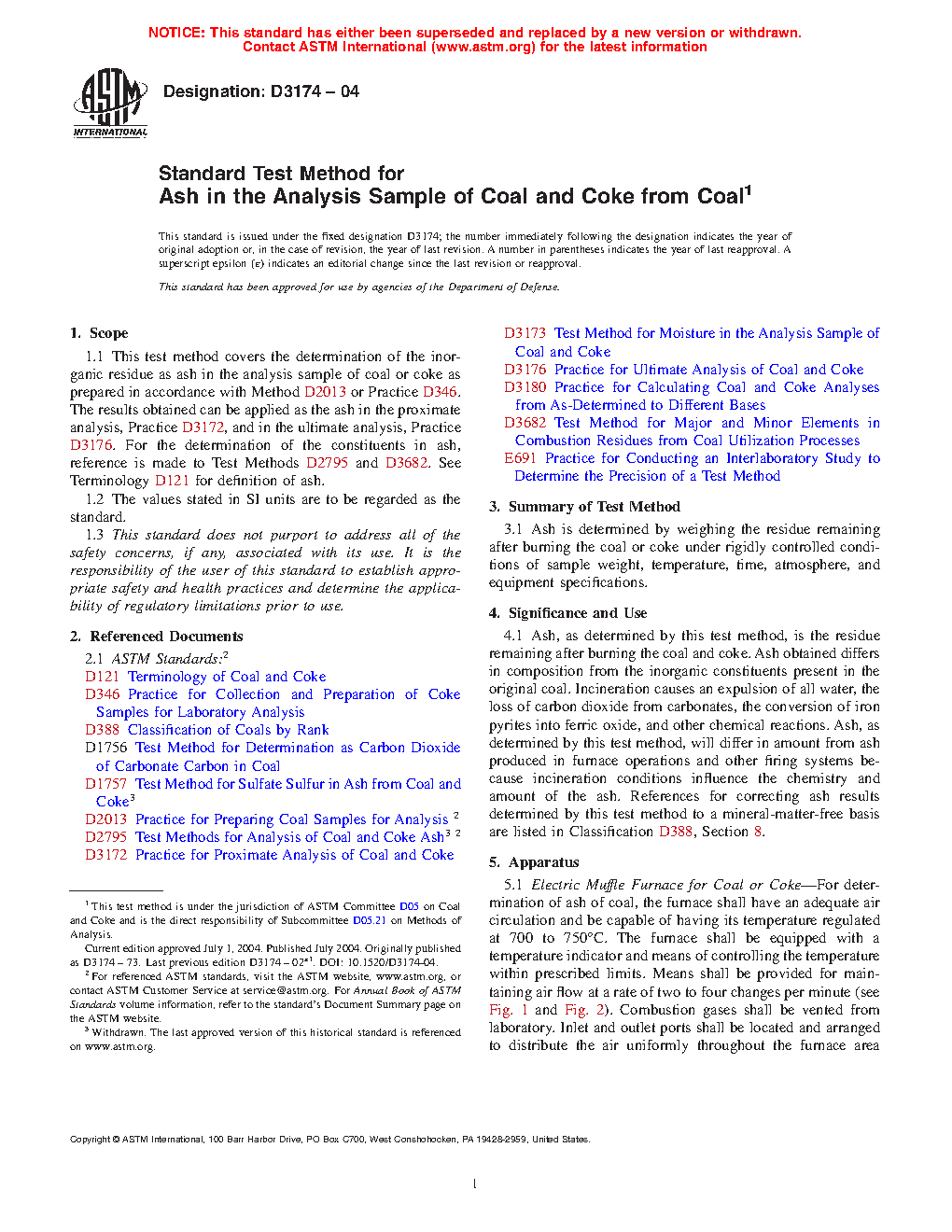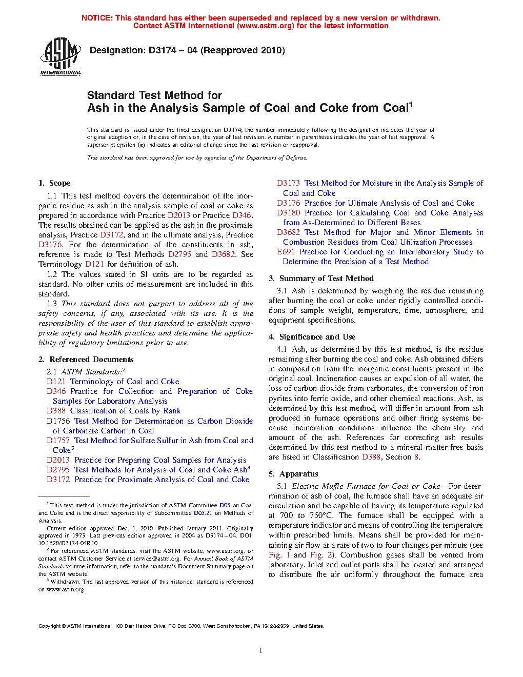 1.1 This test method covers the determination of the inorganic residue as ash in the analysis sample of coal or coke as prepared in accordance with Practice D2013 or Practice D346. The results obtained can be applied as the ash in the proximate analysis, Practice D3172, and in the ultimate analysis, Practice D3176. For the determination of the constituents in ash, reference is made to Test Methods D3682, D4326, and D6349. Test Methods D6357 should be used to prepare ash to be used for trace element analysis. See Terminology D121 for definition of ash.