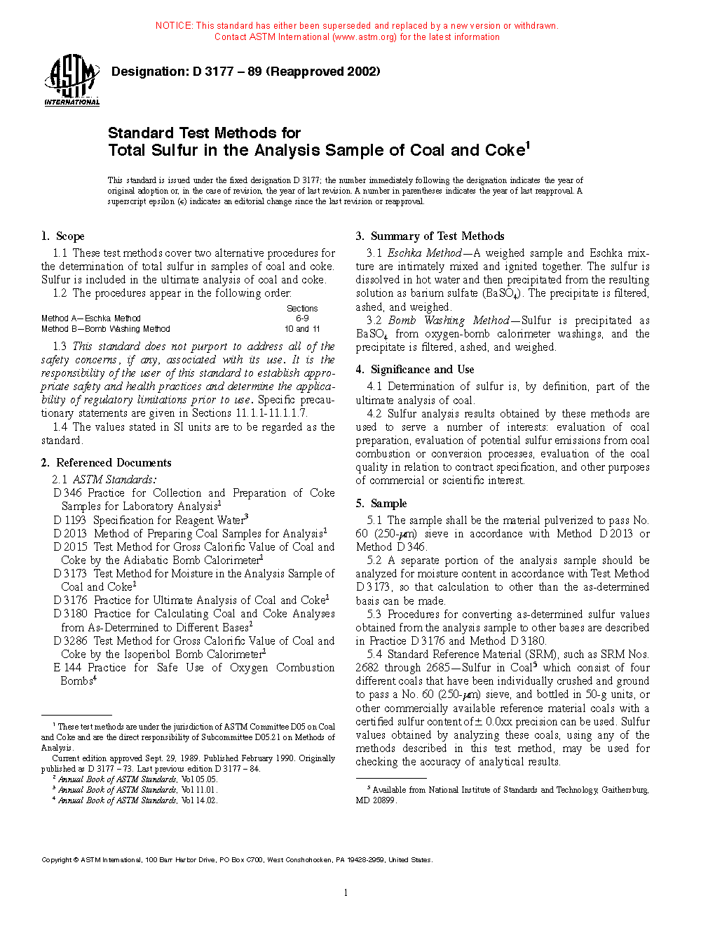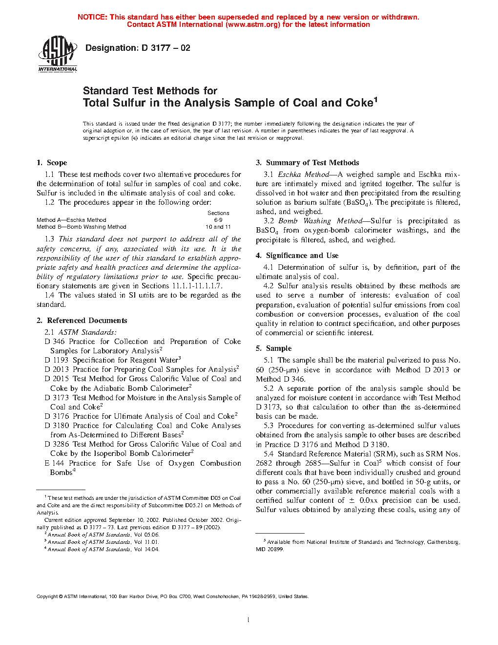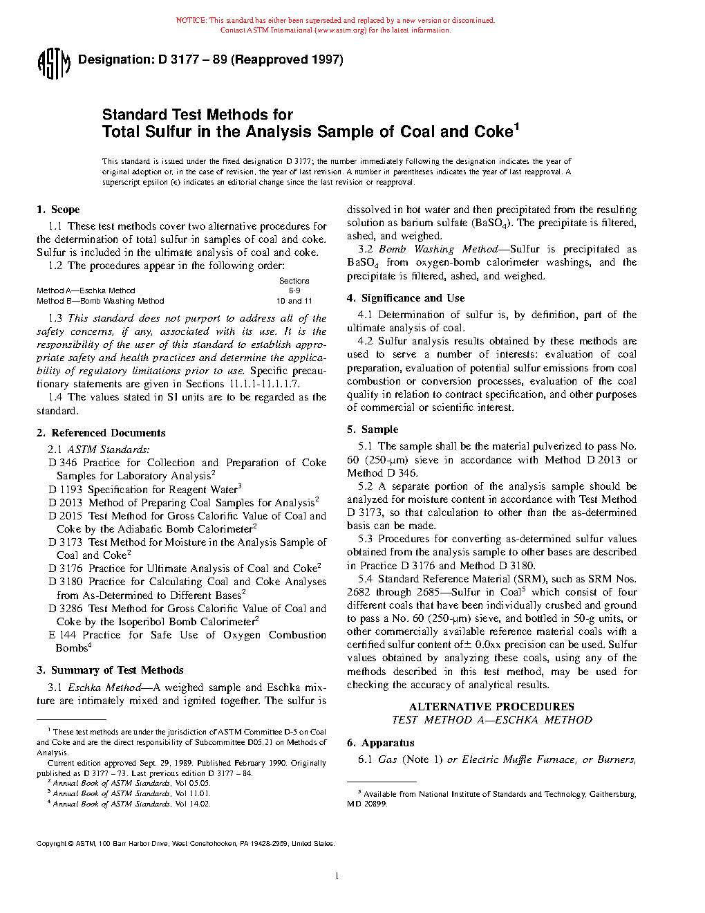 Sections Method A---Eschka Method 6 to 9 Method B---Bomb Washing Method 10 to 111.3 This standard may involve hazardous materials, operations, and equipment. This standard does not purport to address all of the safety problems associated with its use. It is the responsibility of the user of this standard to establish appropriate safety and health practices and determine the applicability of regulatory limitations prior to use. Specific precautionary statements are given in Sections 11.1.1 to 11.1.1.7.
