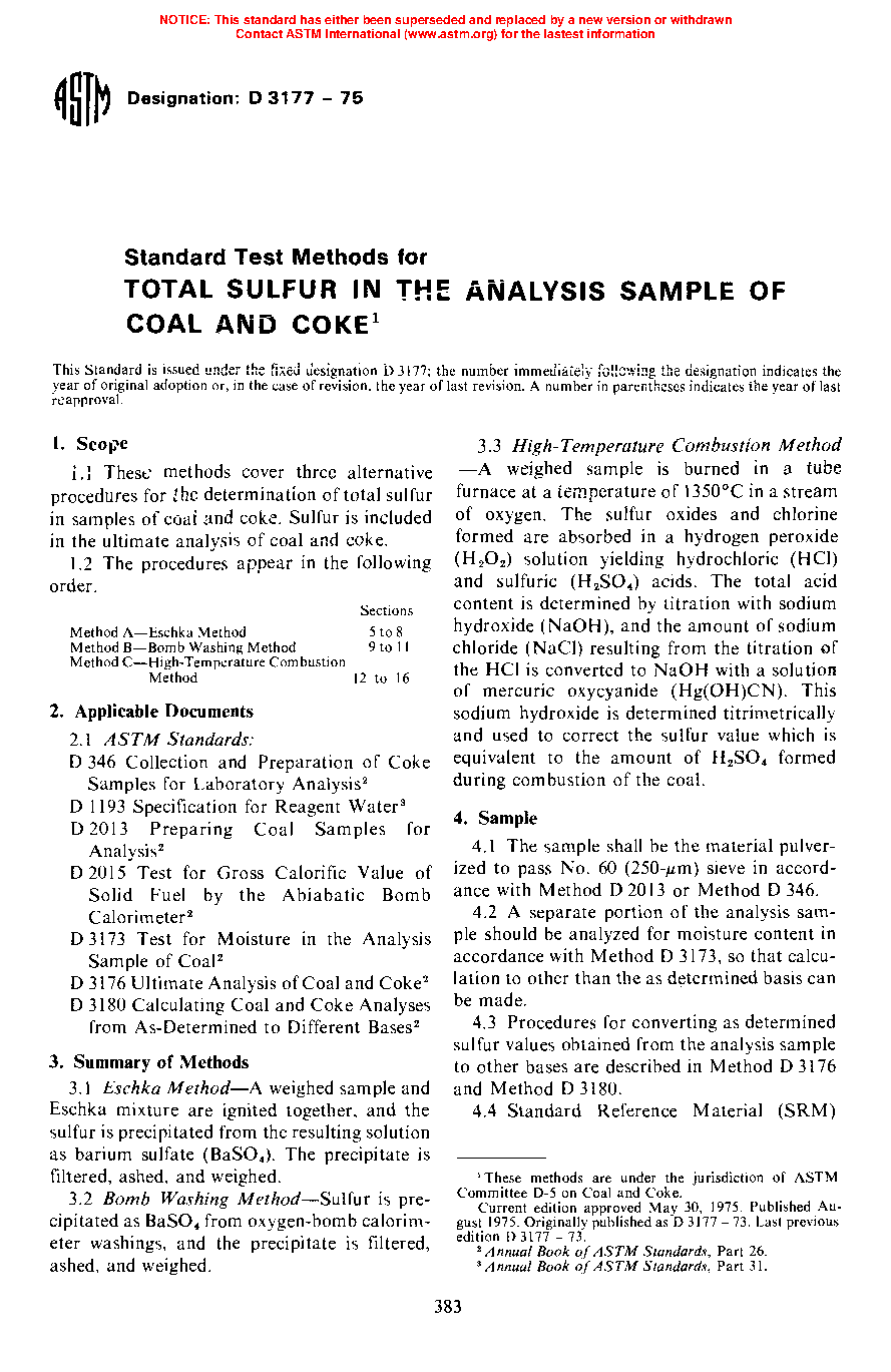 1.1 These test methods cover two alternative procedures for the determination of total sulfur in samples of coal and coke. Sulfur is included in the ultimate analysis of coal and coke.