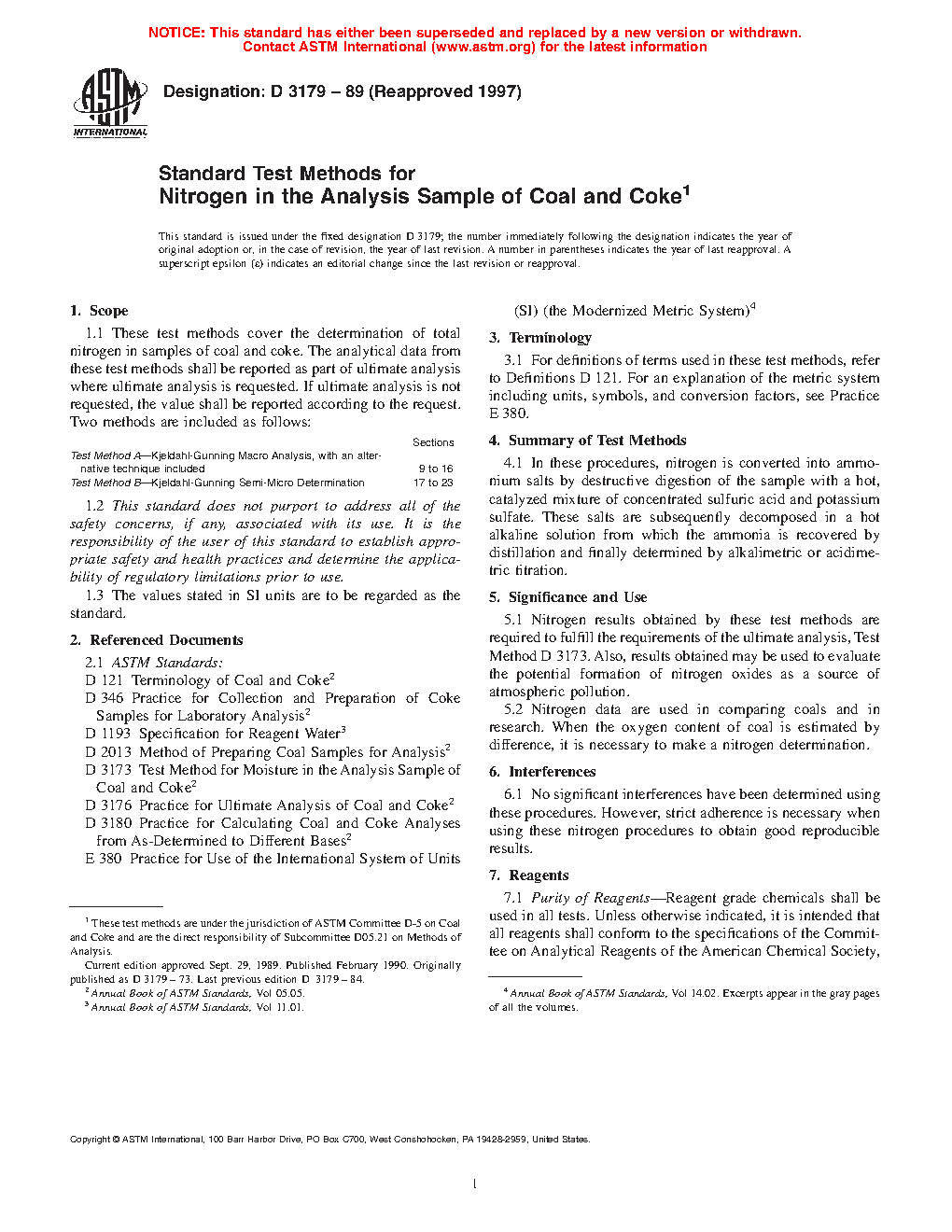 1.1 These test methods cover the determination of total nitrogen in samples of coal and coke. The analytical data from these test methods shall be reported as part of ultimate analysis where ultimate analysis is requested. If ultimate analysis is not requested, the value shall be reported according to the request. Two methods are included as follows: